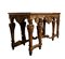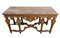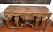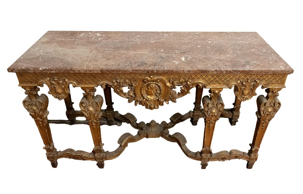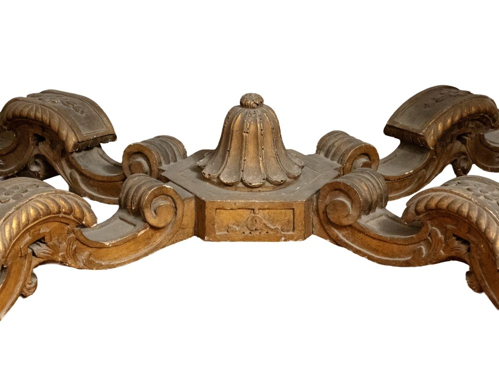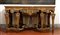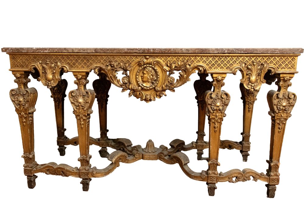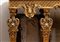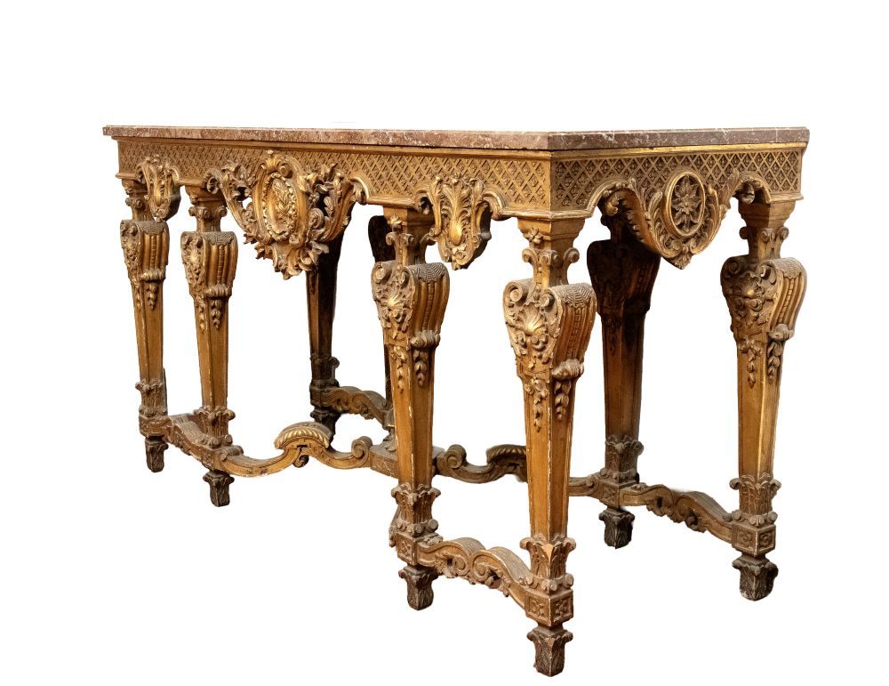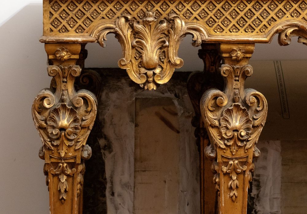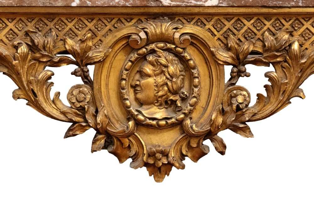 importante coppia di console a parete, caratterizzate da struttura architettonica con sei gambe anteriori e posteriori, riccamente scolpite con motivi fogliacei, volute e cartigli. Fascia sottopiano decorata con motivo a losanghe e medaglioni centrali con profilo classico di testa maschile. Piano superiore in marmo sagomato.