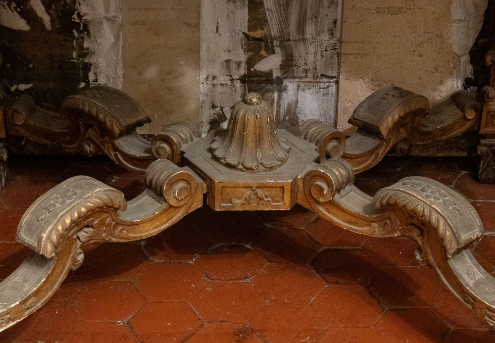 Coppia di grandi consolle in legno intagliato e dorato con piano in marmo stile Luigi XVI XIX secolo