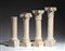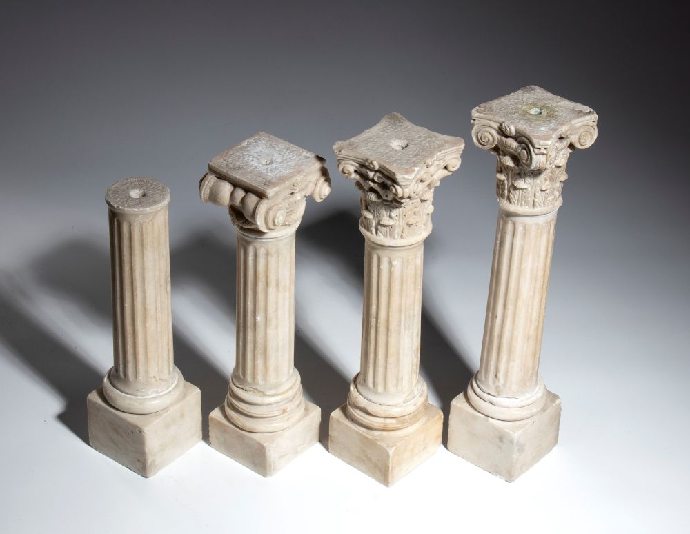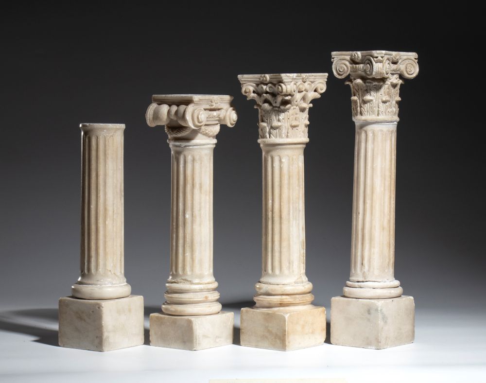 finemente scolpite in marmo. La serie illustra l'evoluzione degli ordini architettonici e comprende la colonna dorica, ionica, corinzia e composita, ognuna poggiante su un plinto quadrangolare. La lavorazione accurata dei dettagli suggerisce una produzione per i viaggiatori del Grand Tour.