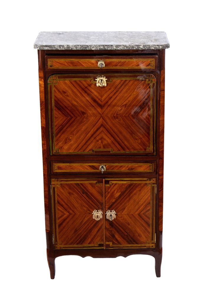 lastronato in legno di ebano viola (Dalbergia cearensis) con motivi geometrici, con calatoia a celare scarabattolo e due cassetti, la parte inferiore a due ante.