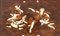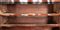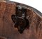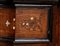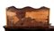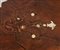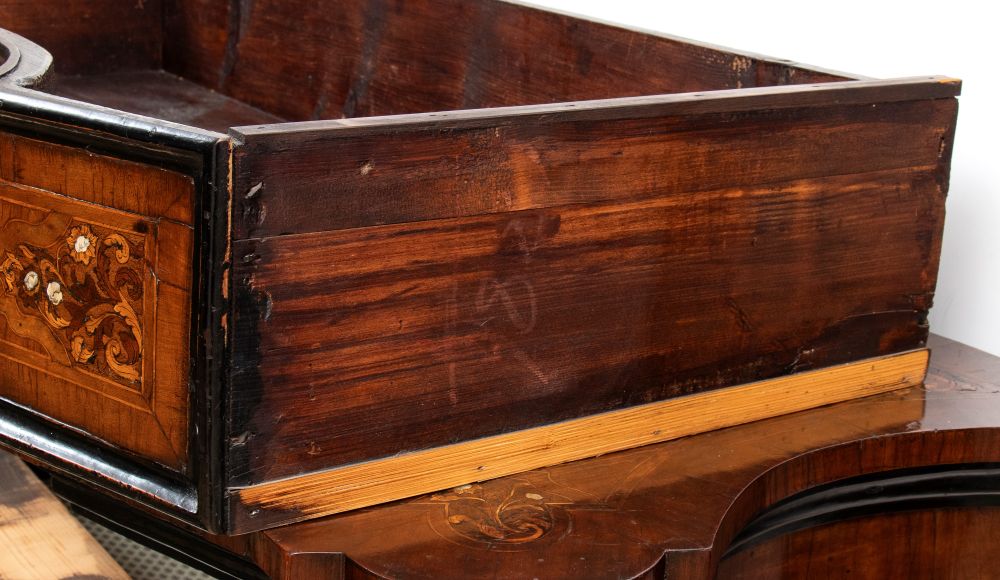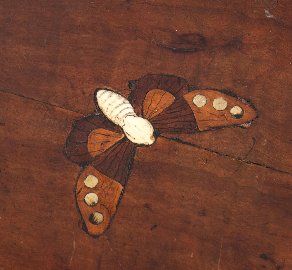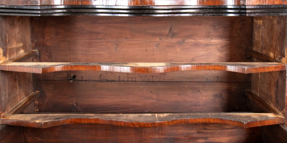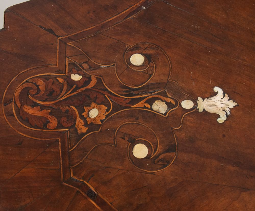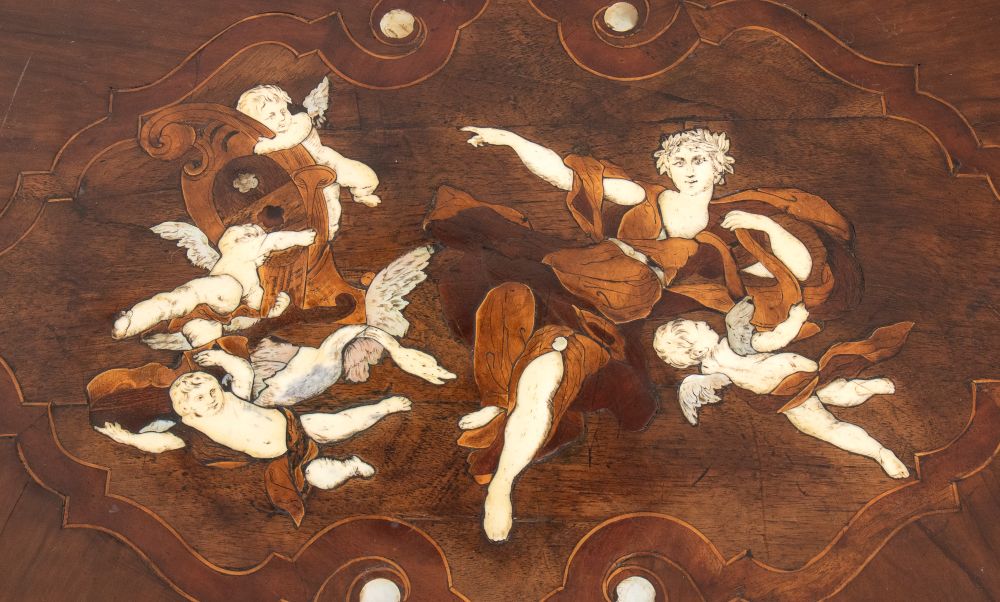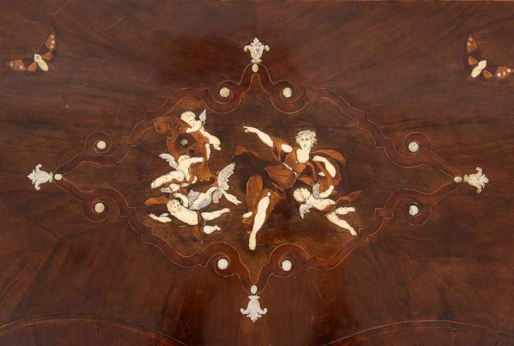 mosso sul fronte e sui fianchi. Interamente lastronato in essenze pregiate, noce e radica, è arricchito da intarsi floreali in osso, madreperla e legni di frutto. Piano sagomato, intarsiato al centro con una figura allegorica e putti danzanti, ai lati, motivi decorativi con farfalle e racemi completano la composizione.