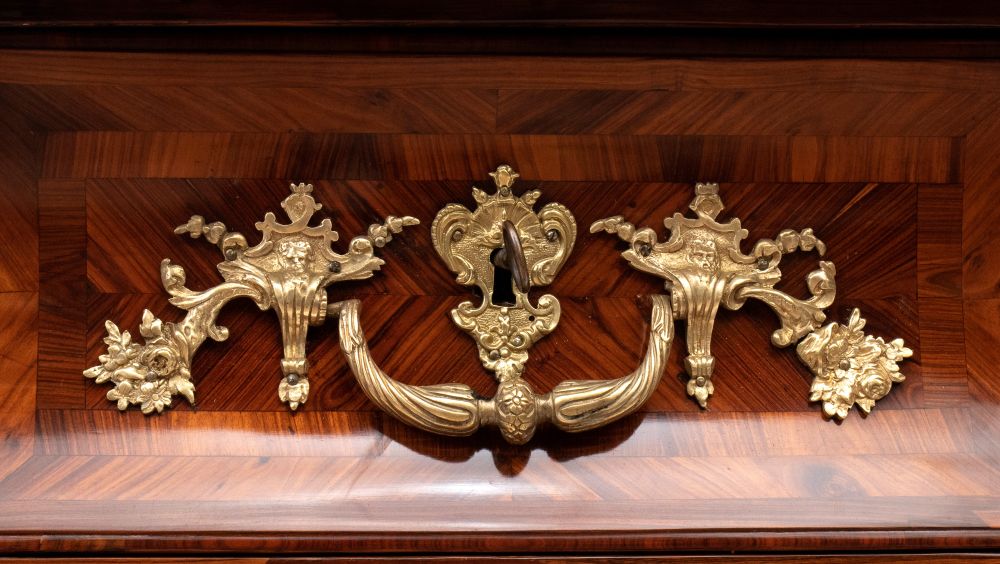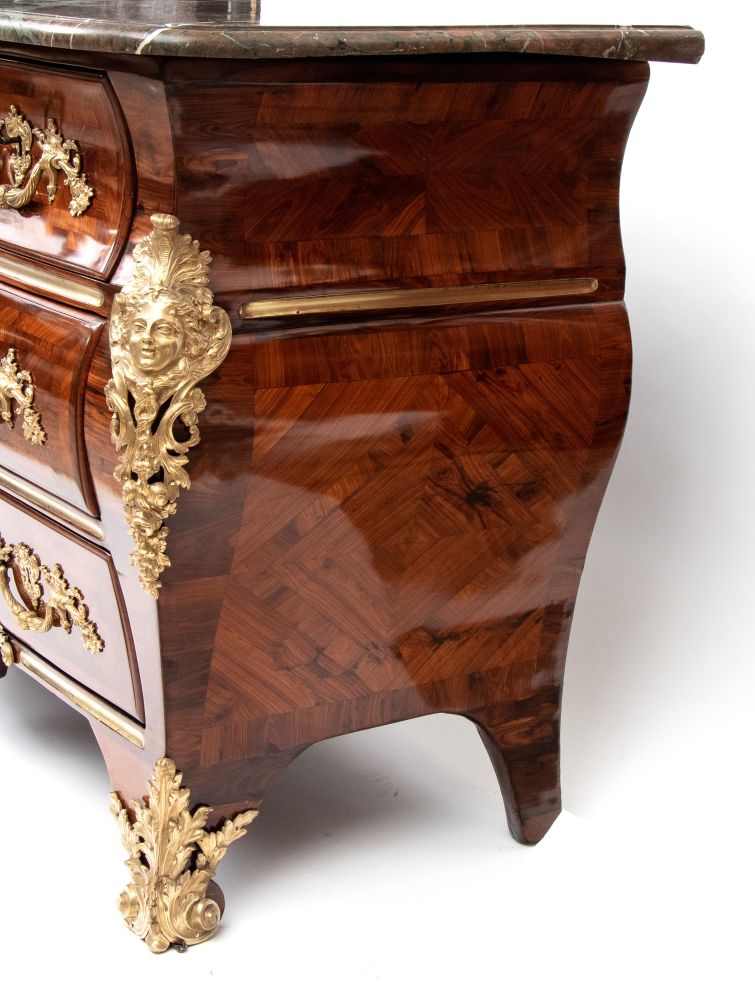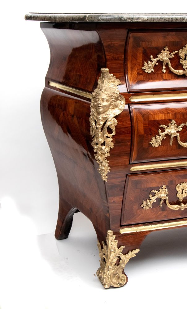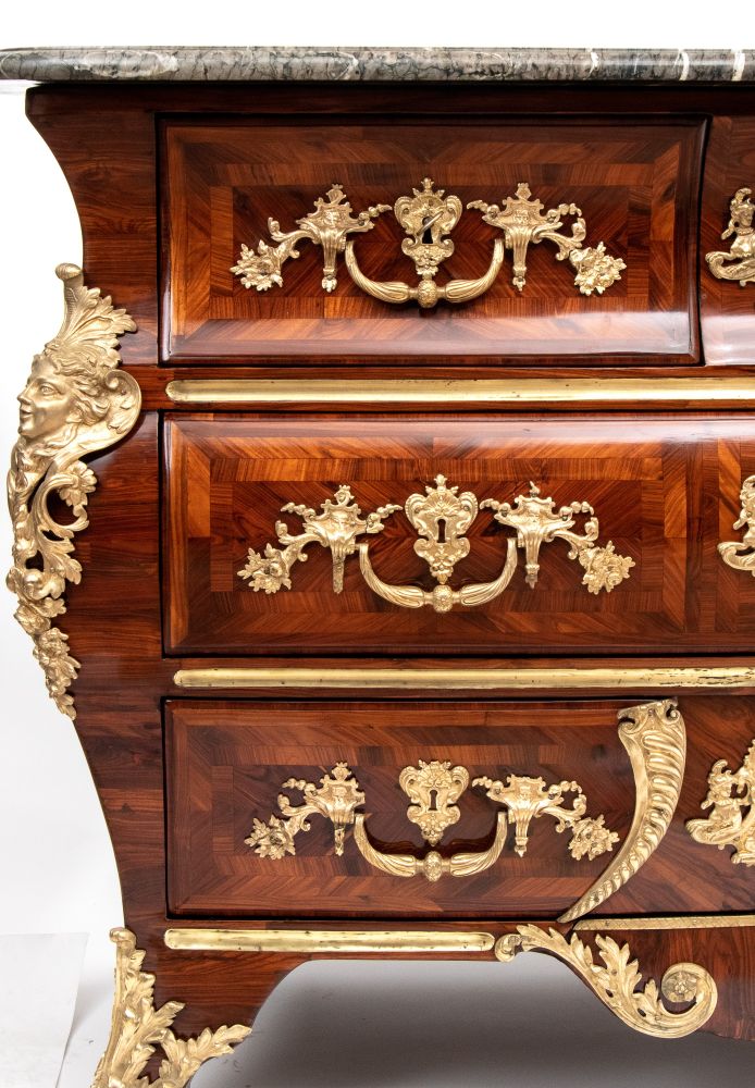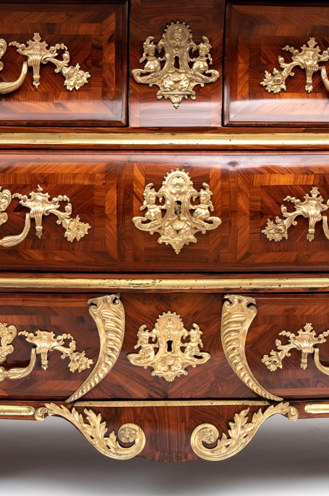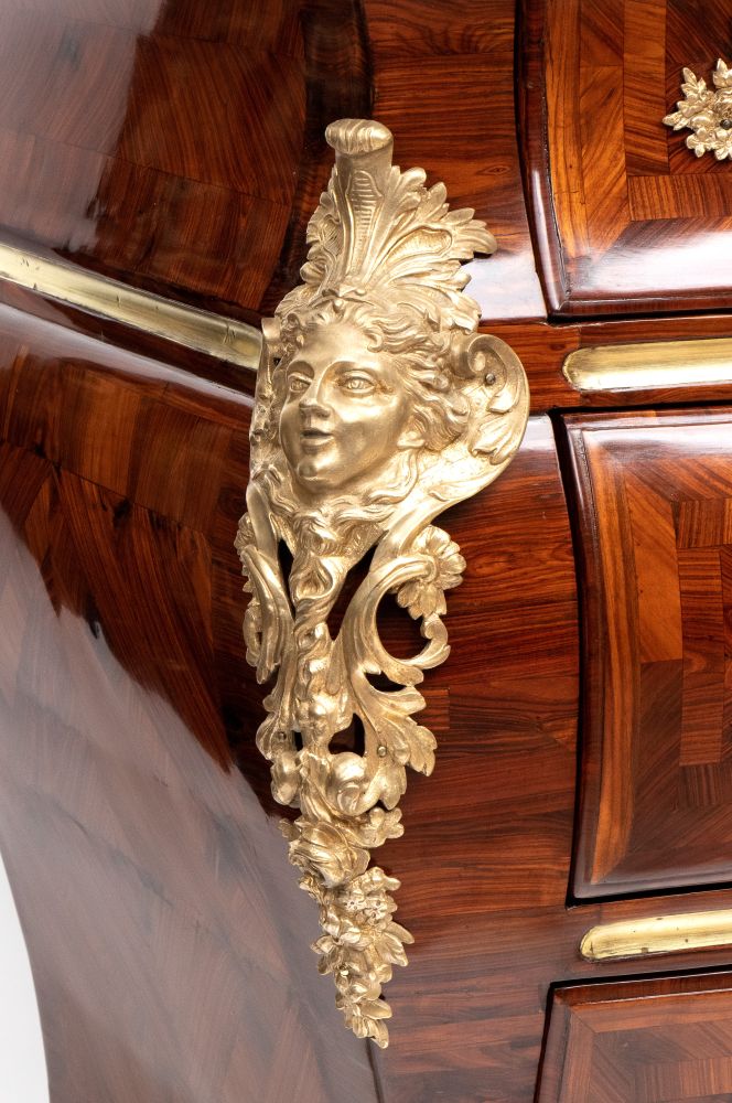 Si noterà che i bronzi delle tre commodes si ispirano a quelli di André-Charles Boulle, sia nei mascheroni di Flora usati come bocchette per le serrature, sia nei piedi a forma di zampa di leone, o ancora — sulla commode dell’ex collezione Couderc — nelle cariatidi con teste di mascheroni femminili ornate da palmette.