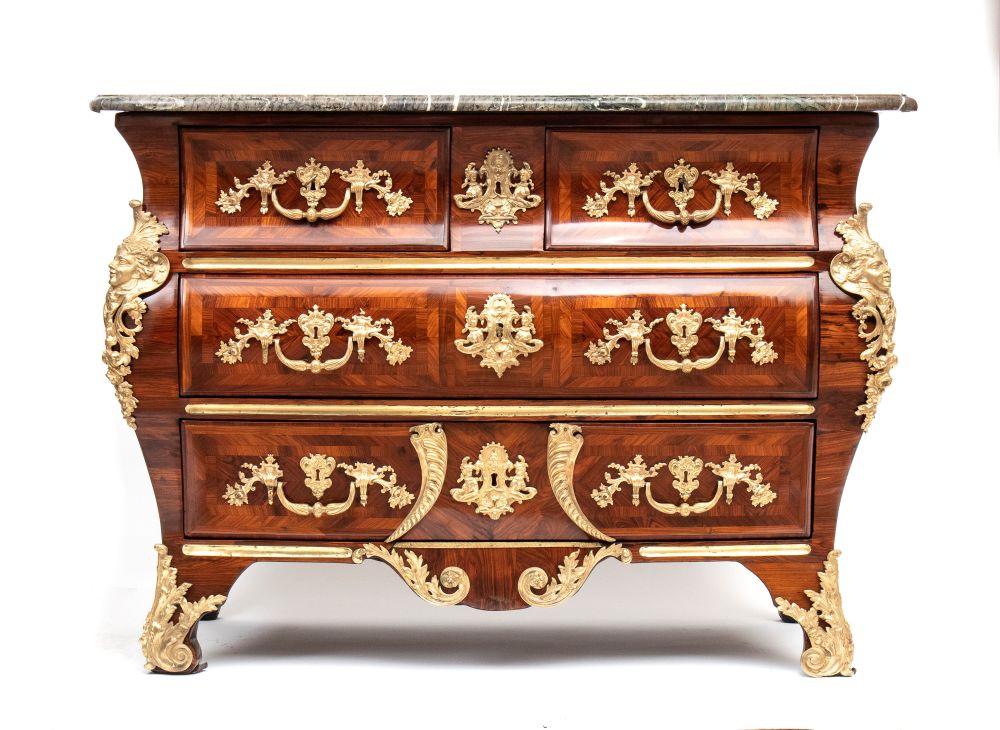 A parte il monogramma PM, la commode dell’antica collezione Jules Couderc presentava anche un’etichetta di “Bertin, marchand et mercier, à la Toison d’Or, rue du Roule”, datata 1722, che permette di datare l’insieme di questi mobili.