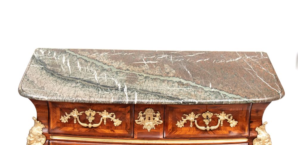 Comò bombato in stile Luigi XV copn iano sagomato in marmo Brèche grigio, lastronato in bois de violette (Dalbergia cearensis, Ducke, 1925) e in bois de rose (Dalbergia spp.) con intarsi a spina.