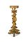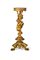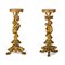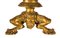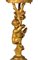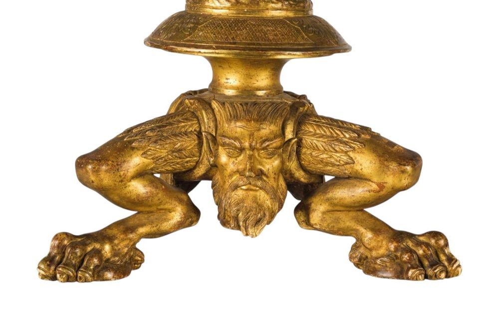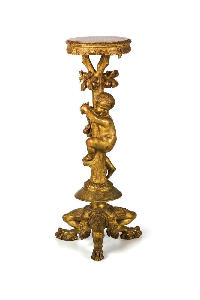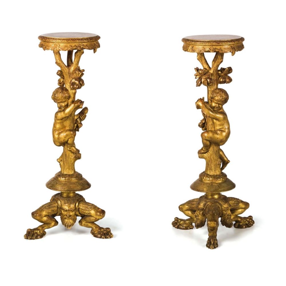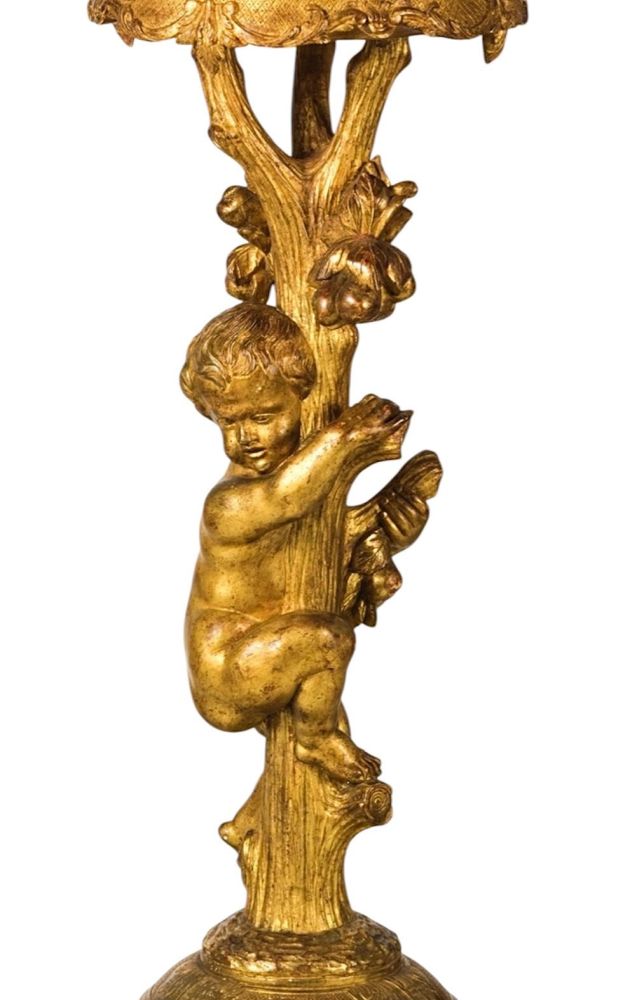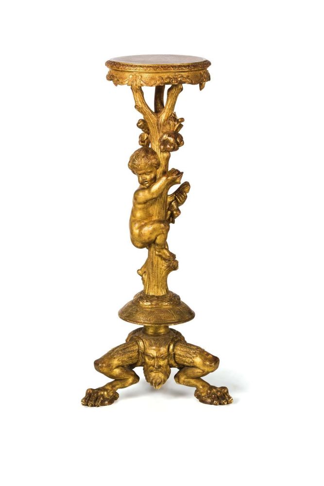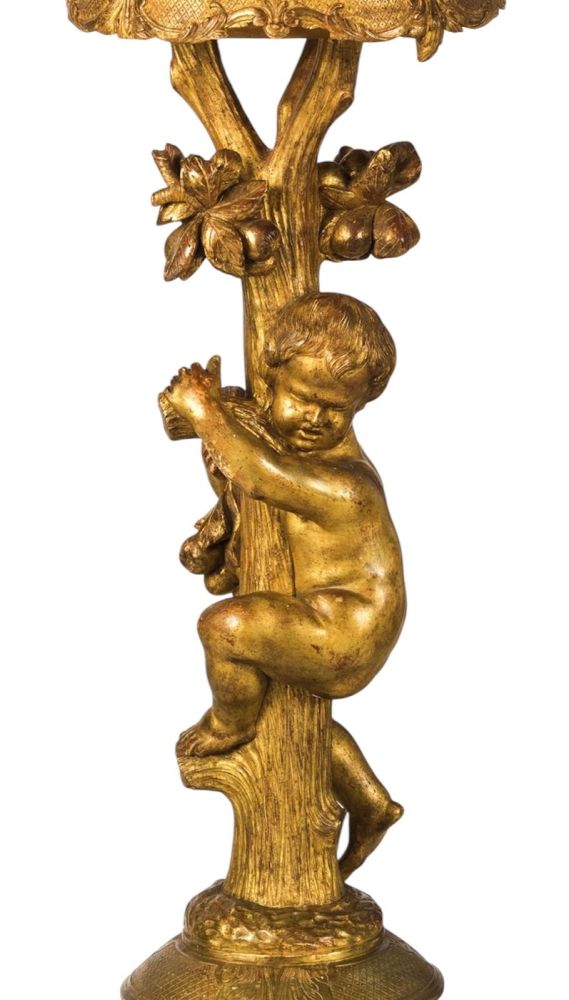 in legno intagliato e dorato, presentano un piano circolare sostenuto da un fusto scultoreo di forte impatto plastico. Il sostegno centrale è caratterizzato da una figura di putto, colto in un movimento dinamico mentre si avvinghia a un tronco naturalistico arricchito da foglie e motivi vegetali, elemento che conferisce all’insieme un senso di leggerezza e vivacità. La base tripartita, anch’essa riccamente intagliata, poggia su piedi ferini finemente modellati, tipici del linguaggio decorativo barocco, che garantiscono stabilità e al contempo accentuano il carattere monumentale dell’oggetto. La cintura del piano è ornata da motivi a foglia e decori a rilievo, eseguiti con grande perizia. La doratura, calda e luminosa, valorizza la qualità dell’intaglio e contribuisce a creare un effetto di grande prestigio, rendendo questi guéridon ideali come elementi d’accento in ambienti classici o eclettici: oggetti di alta rappresentanza, pensati originariamente per sostenere sculture, vasi o candelabri, oggi si prestano perfettamente come tavolini decorativi o supporti espositivi.