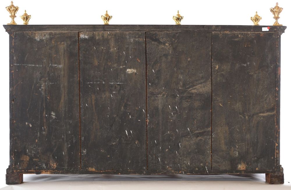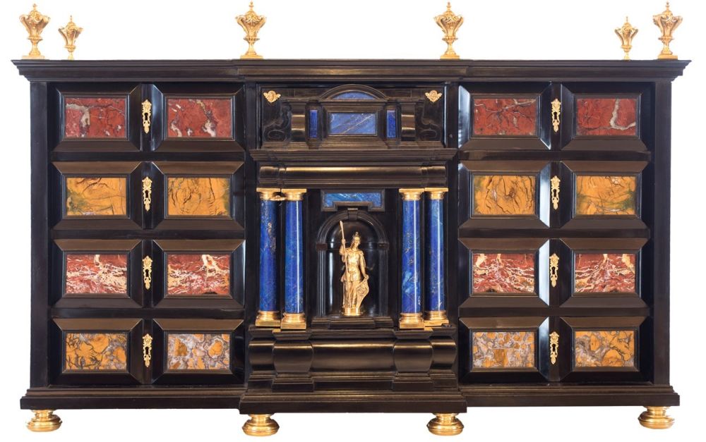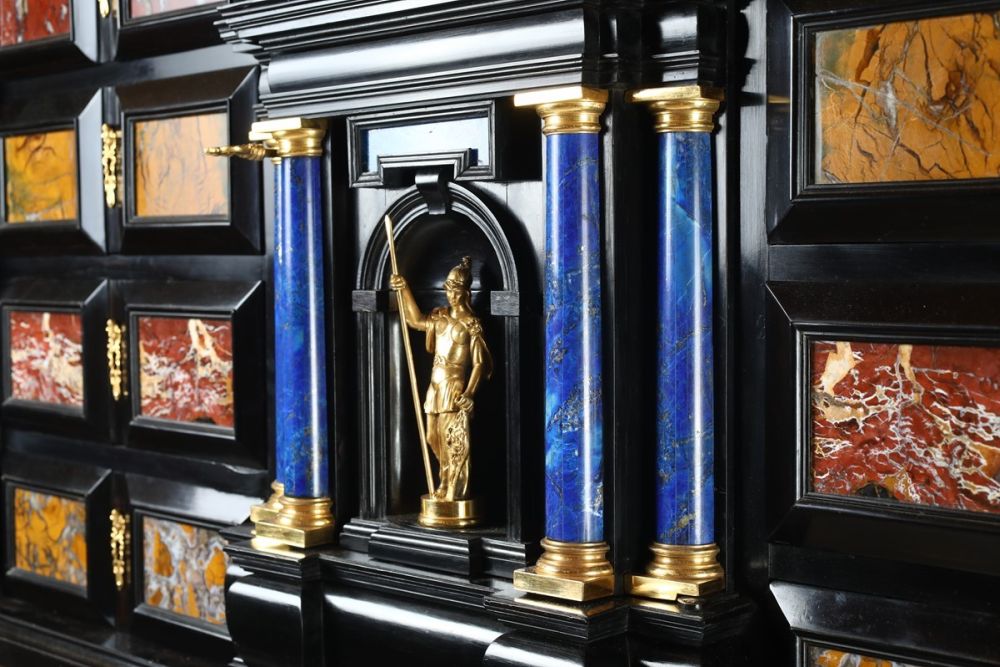 L'impiego di pietre dure e campionature di marmi colorati per gli arredi di rappresentanza raggiunse il suo apice tra il XVI e il XVIII secolo. Questa moda si diffuse ampiamente tra le classi altolocate dell'epoca, costantemente alla ricerca di materiali preziosi e da collezione per i propri studioli. In questo esemplare, l'imponente ma elegante struttura dello stipo è arricchita da una ricercata selezione di marmi, pietre dure e bronzi dorati che ne esaltano la complessità architettonica. Si tratta di cifre stilistiche riscontrabili in molti manufatti realizzati tra Firenze e Roma, in particolare nelle celebri manifatture granducali attive sotto la guida di architetti quali Giovanni Battista Foggini (1652-1725) e Diacinto Maria Marmi (1652-1702).