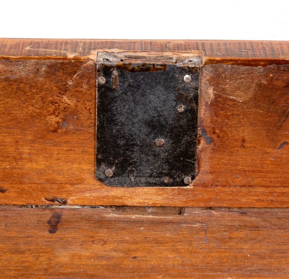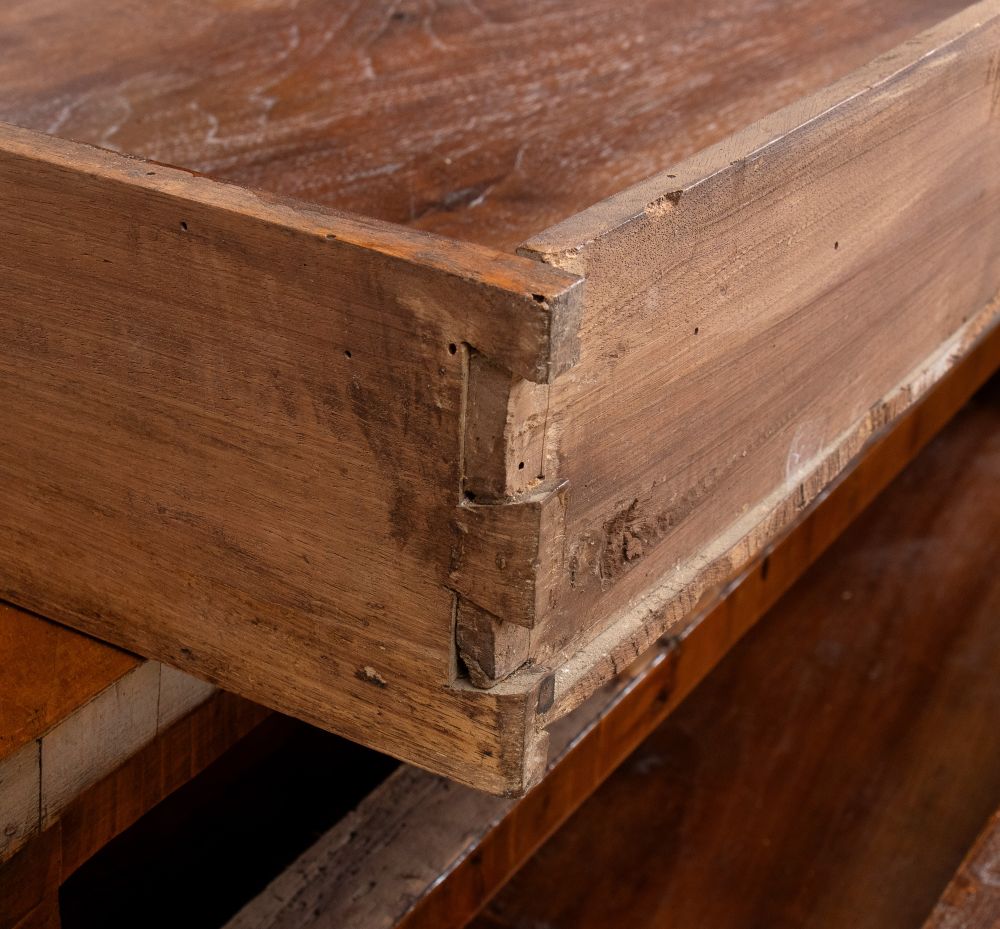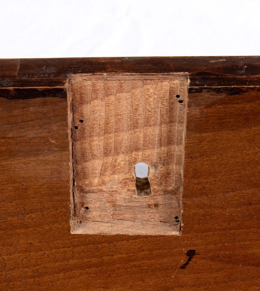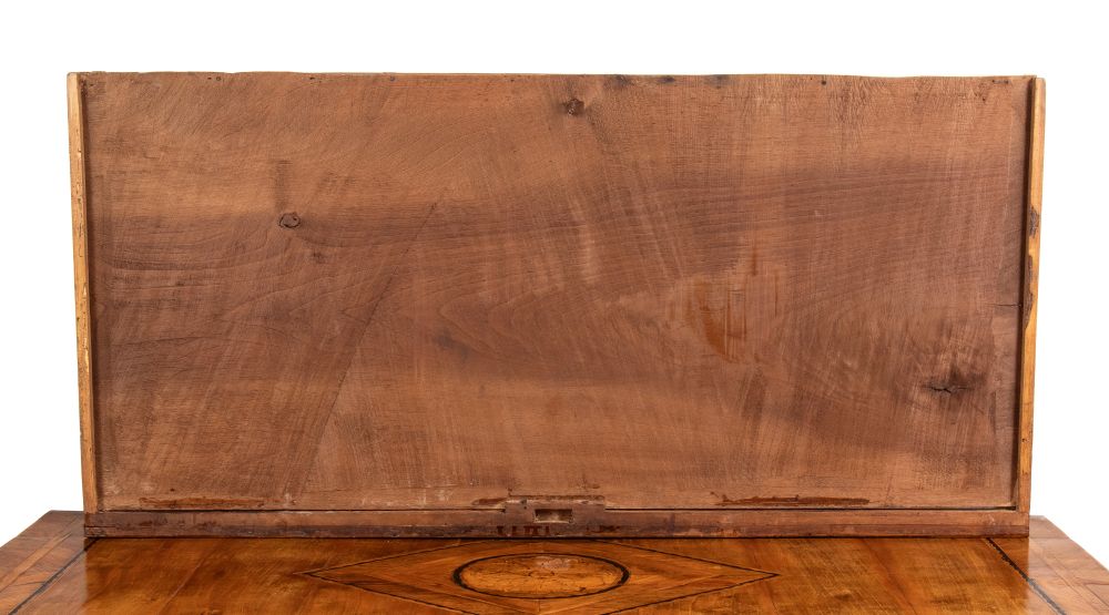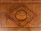 in legno di noce con intarsi a motivi geometrici in legni di frutto. Il piano superiore è decorato con un motivo a rombo con medaglione centrale, che si ritrova anche sul fronte del mobile.