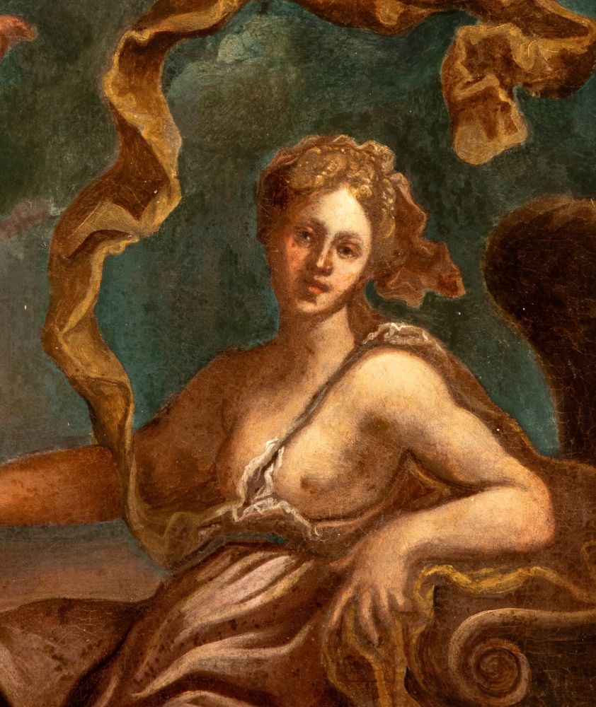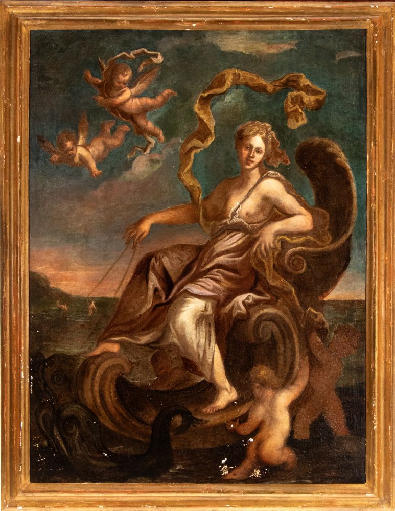 Ritratta su un'elaborata carrozza a forma di conchiglia trainata attraverso le acque, la ninfa è circondata da amorini e putti. Un lungo nastro dorato fluttua sopra la sua testa, espediente che suggerisce movimento. Il tema si ispira al prototipo rinascimentale di Raffaello nella Villa Farnesina, riletto con la sensibilità cromatica del barocco maturo. Cornice dorata coeva.
