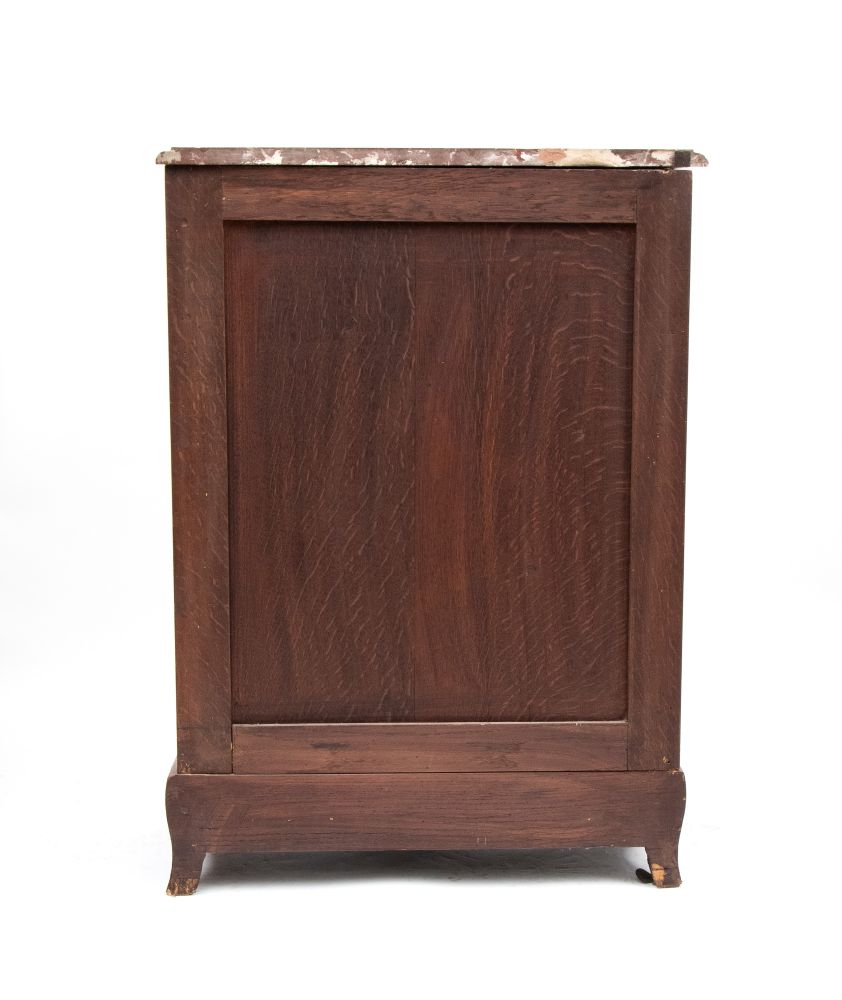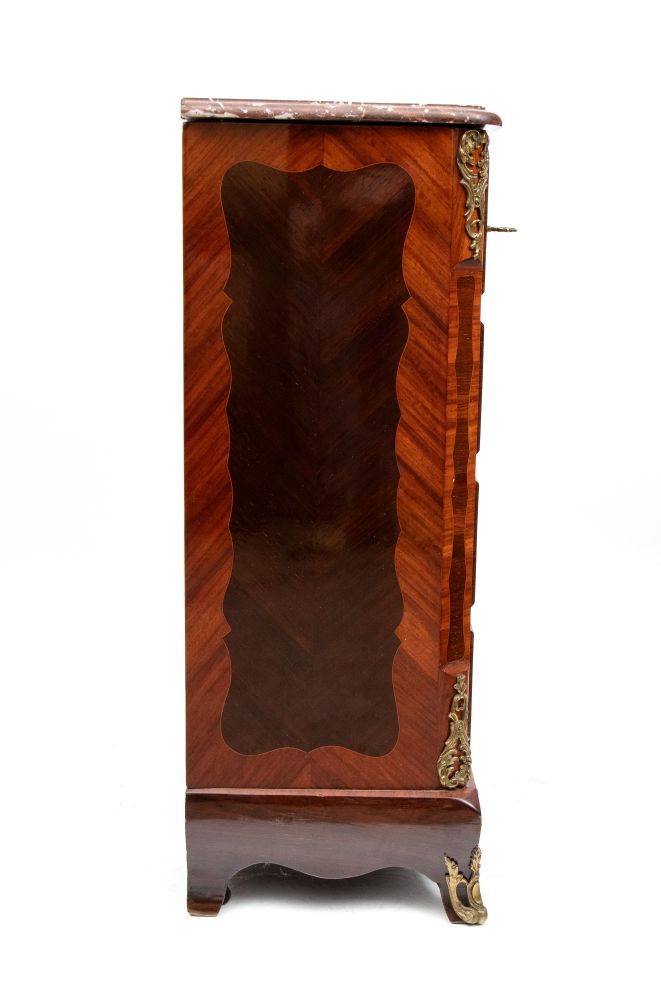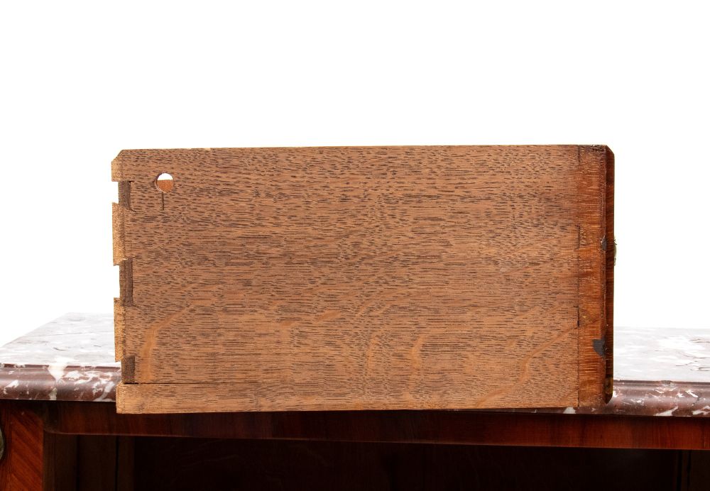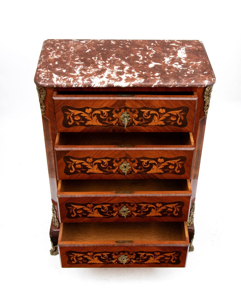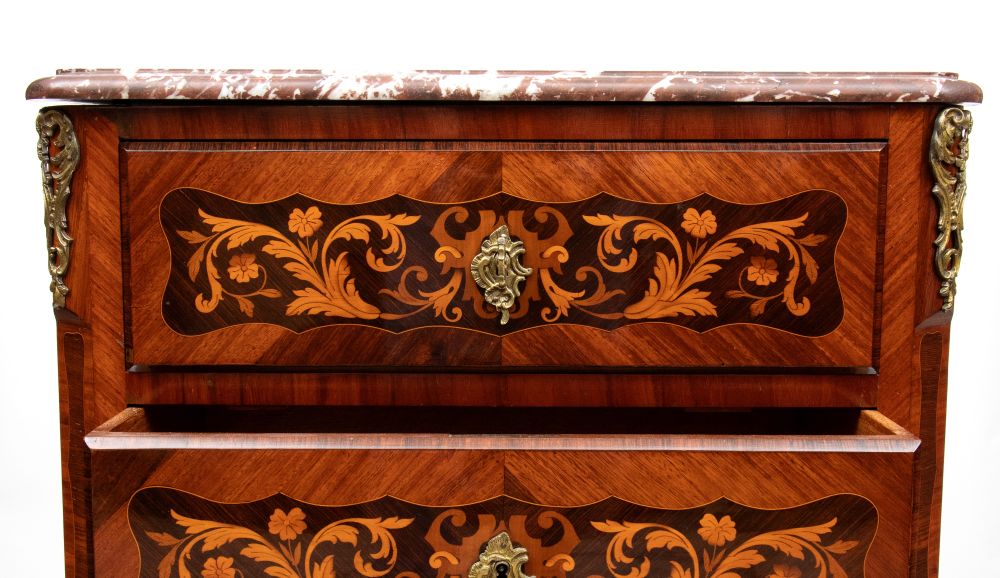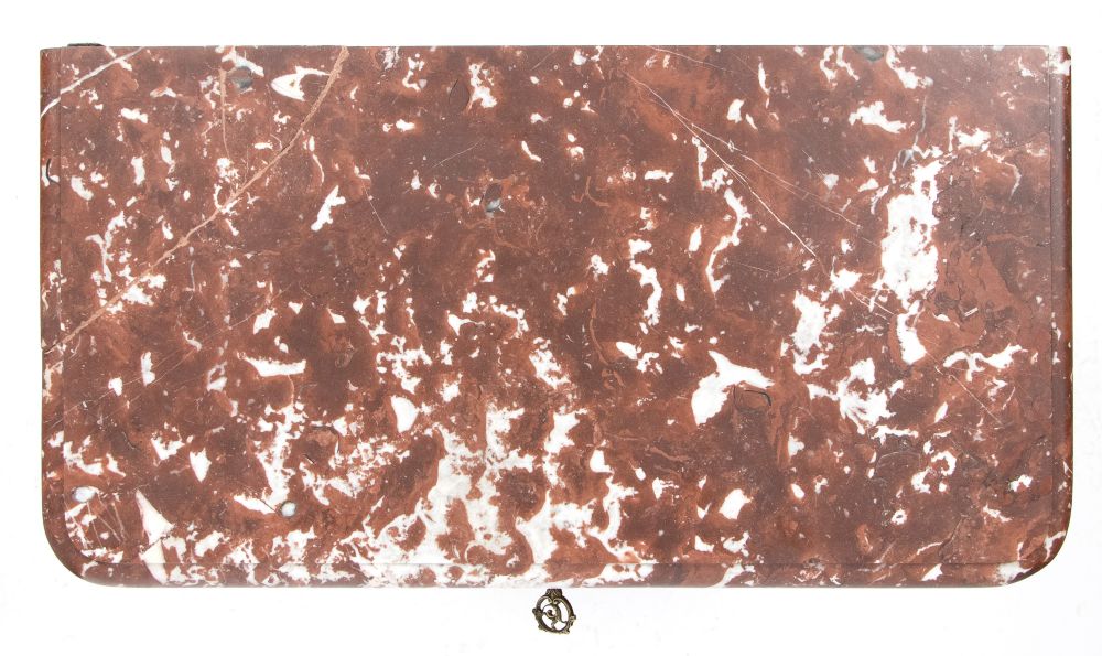 piano in marmo rouge de France, quattro cassetti, in ebano viola con intarsi a motivi floreali su fondo geometrico in legni di frutto. Applicazioni in bronzo dorato.