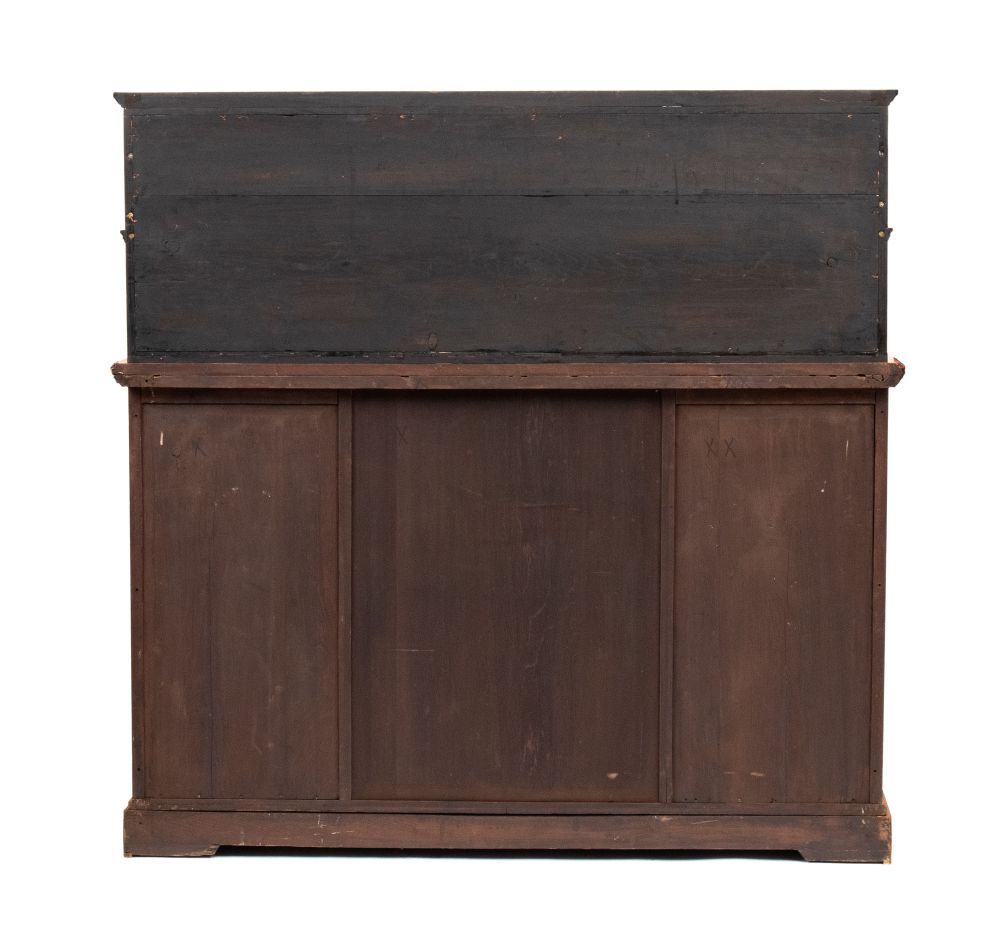 fine periodo Vittoriano, mobile a due sportelli laterali e vano centrale a ripiani. L'alzata, sorretta da colonnine tornite, ha un fondo a specchi originali.