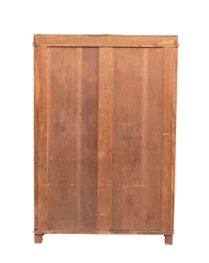 in olmo, con ante a vetro apribili, cappello a timpano e due colonne laterali piatte in legno di calamandra (Dalbergia spp.).