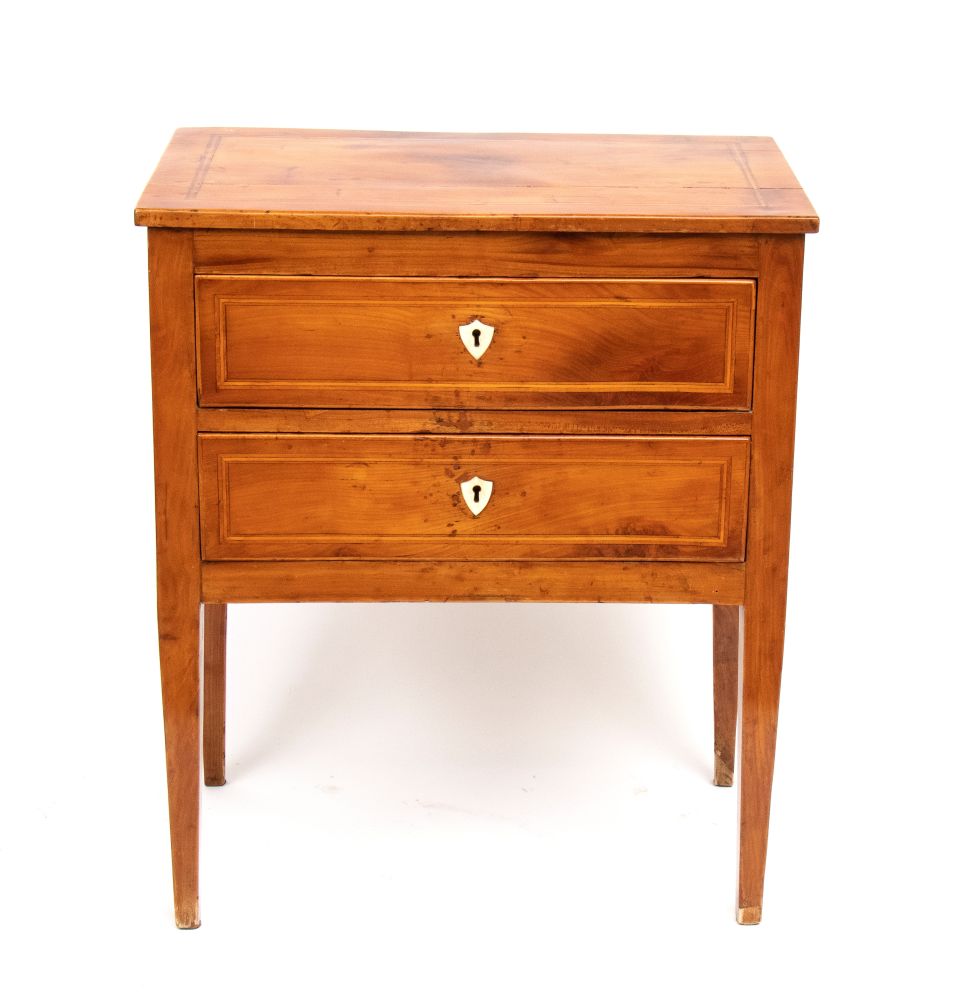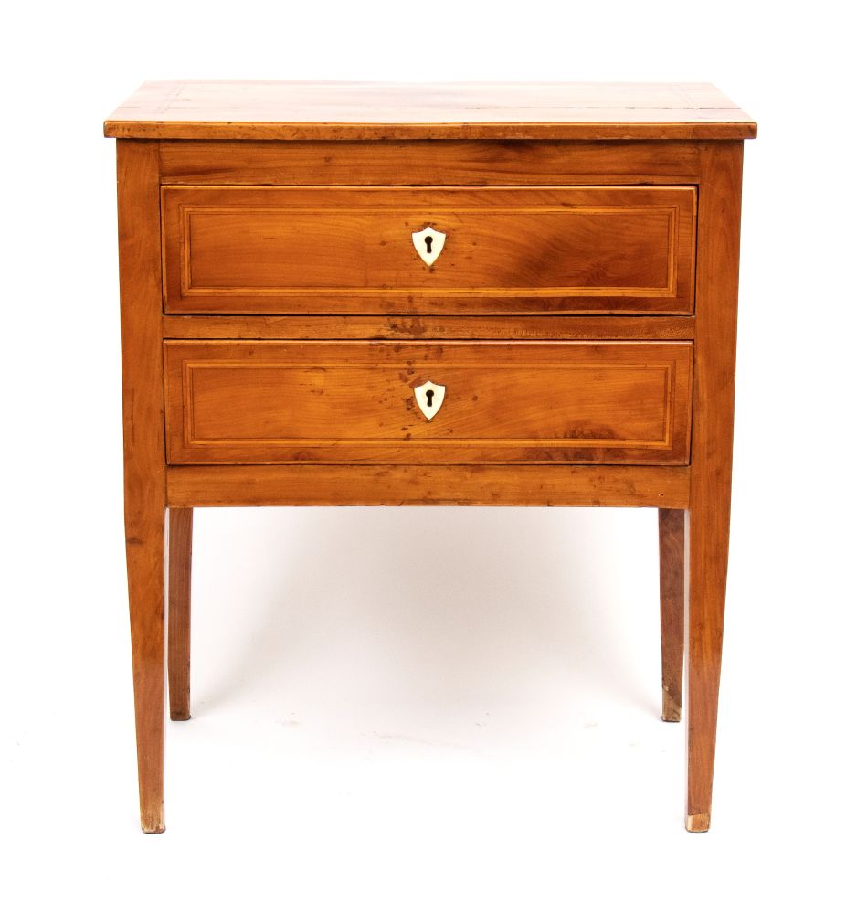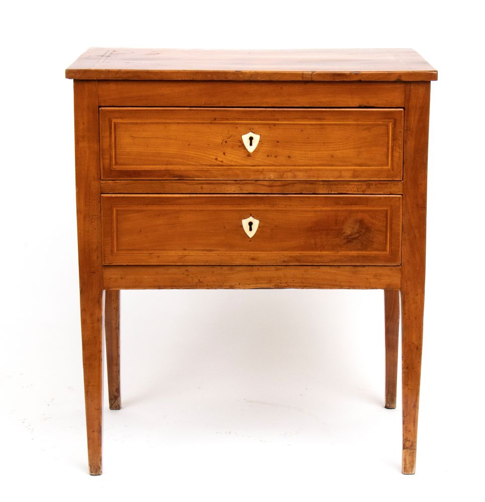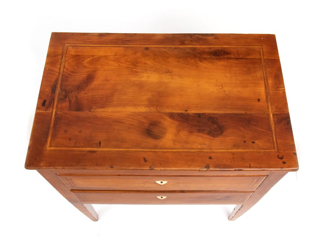 a due cassetti con traversa e gambe tronco piramidali. In legno di noce con intarsi in bosso e bocchette in osso.