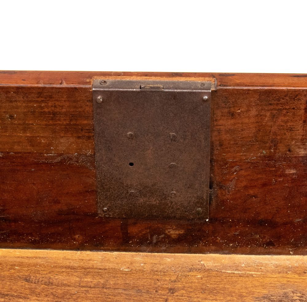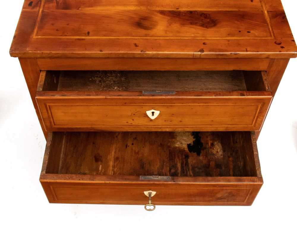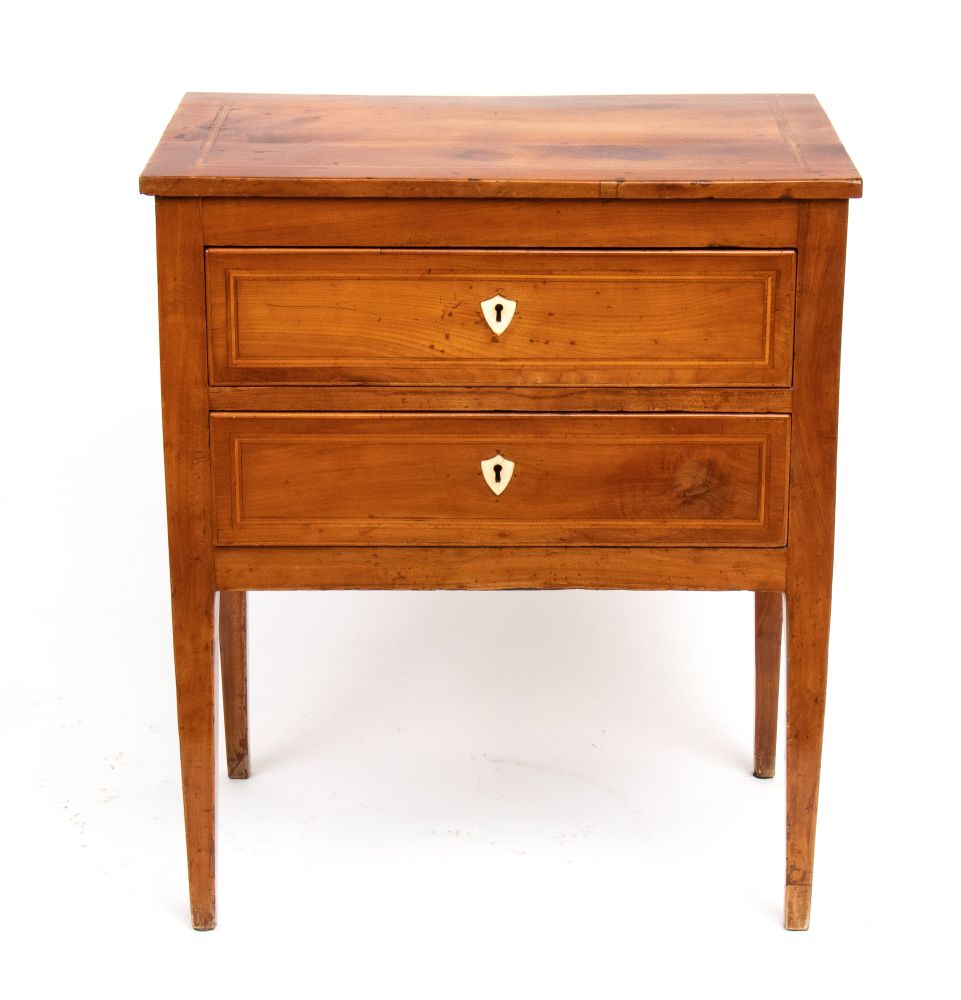 a due cassetti con traversa e gambe tronco piramidali. In legno di noce con intarsi in bosso e bocchette in osso.