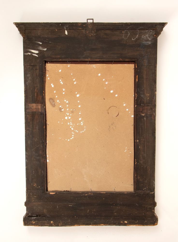 ispirata al gusto rinascimentale, chiamata a "tabernacolo" o a "edicola" per la struttura che richiama i portali architettonici. Decorazioni a rilievo su tutta la superficie con motivi floreali, vasi e volute fogliacee.