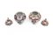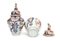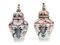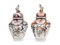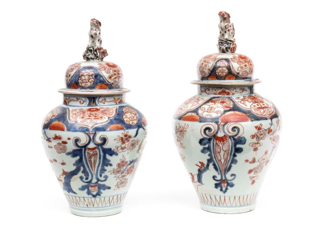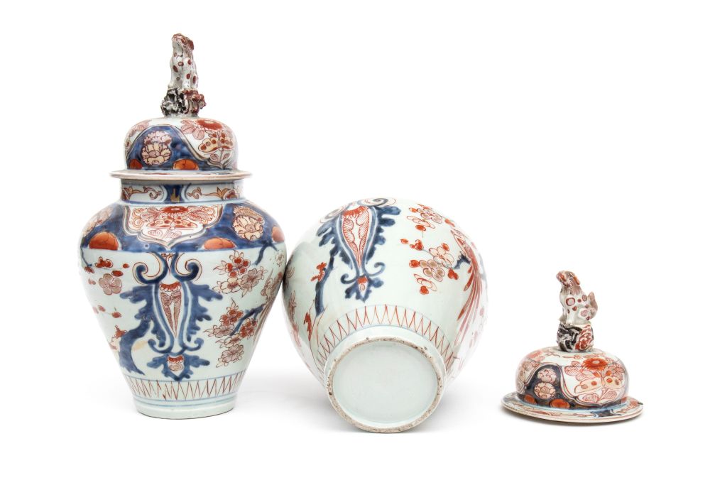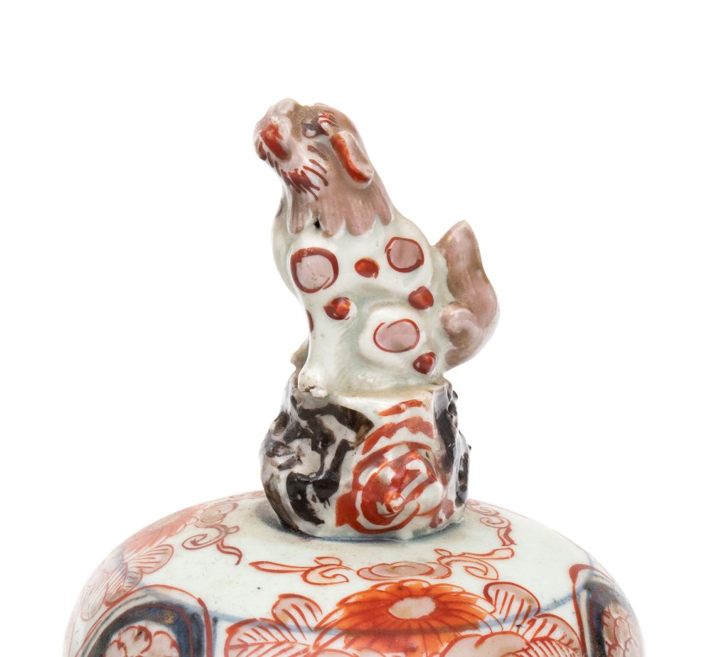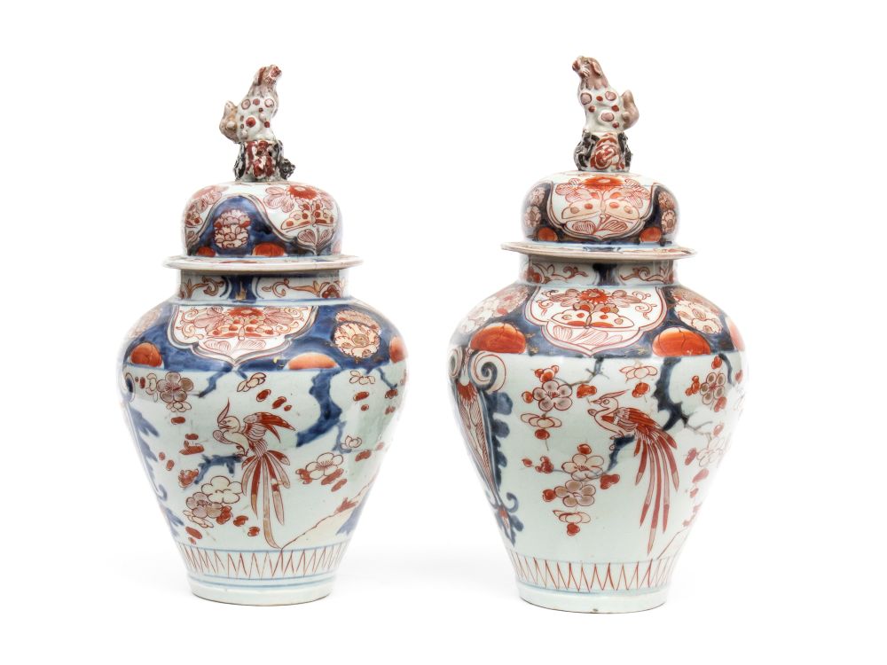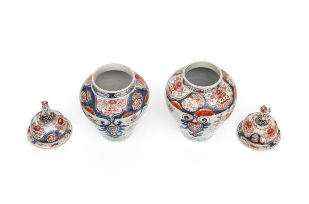 Corpo a balustre ornato da riserve floreali e motivi di peonie e crisantemi su fondo decorato con elementi stilizzati e cartigli. I coperchi, di forma bombata, sono sormontati da presa a forma di cane di Fo modellato e dipinto in smalti policromi.
