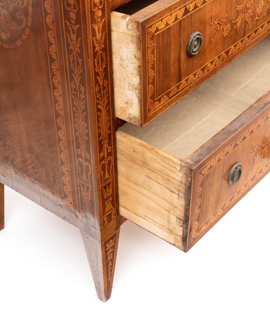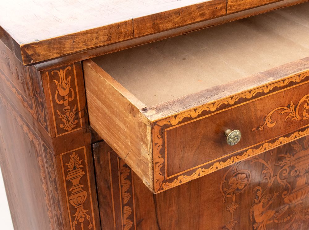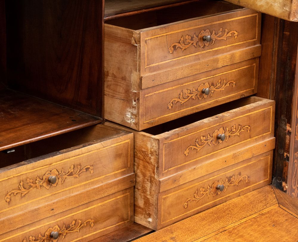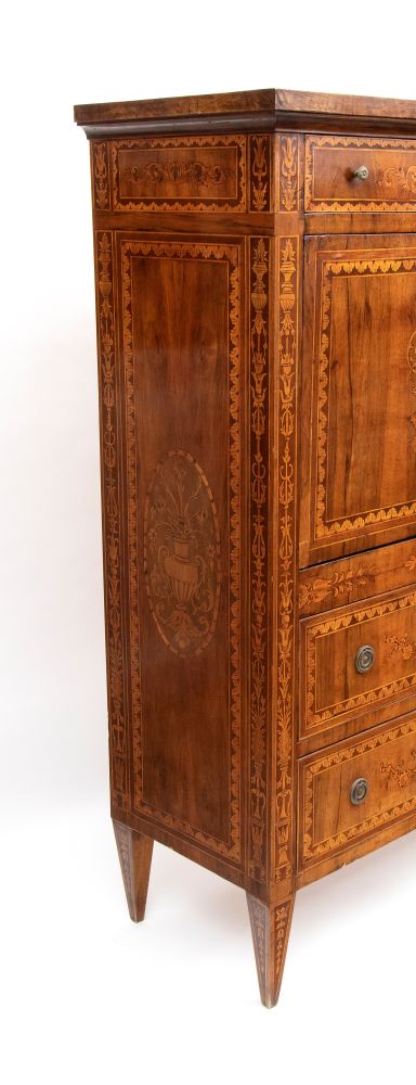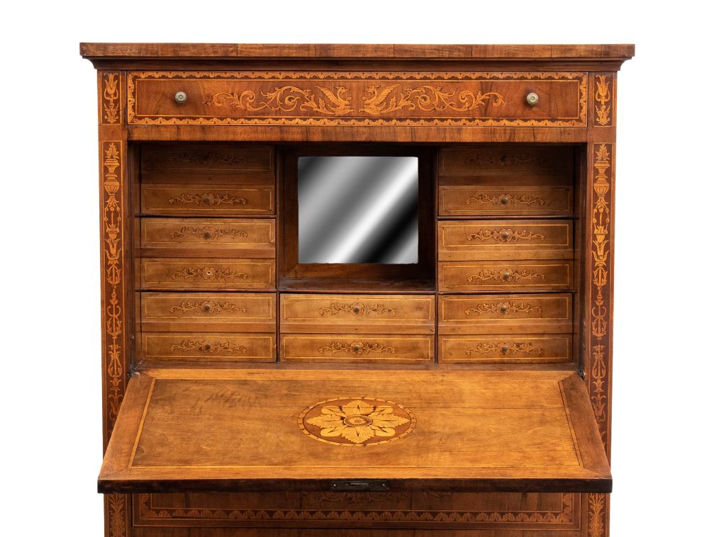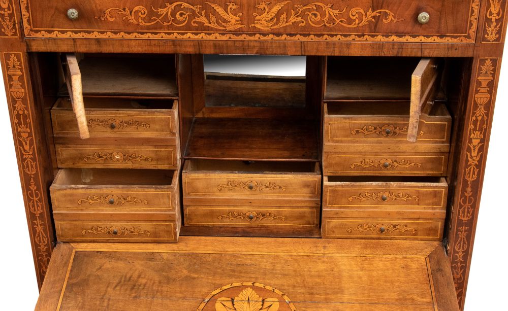 in legno di noce con intarsi floreali, vegetali ed a anfora in legni di frutto. In stile Maggiolini, il secretaire è composto da un cassetto superiore, abbatant con scarabattolo a cassetti doppi e due ad anta con specchio centrale, nella parte inferiore tre cassetti.