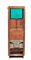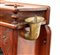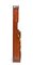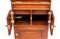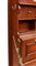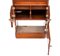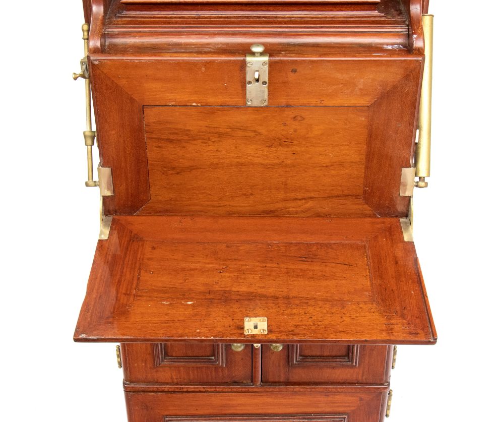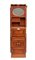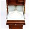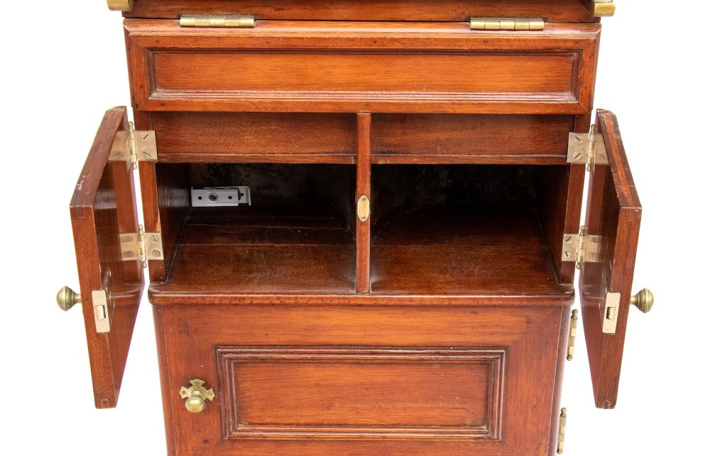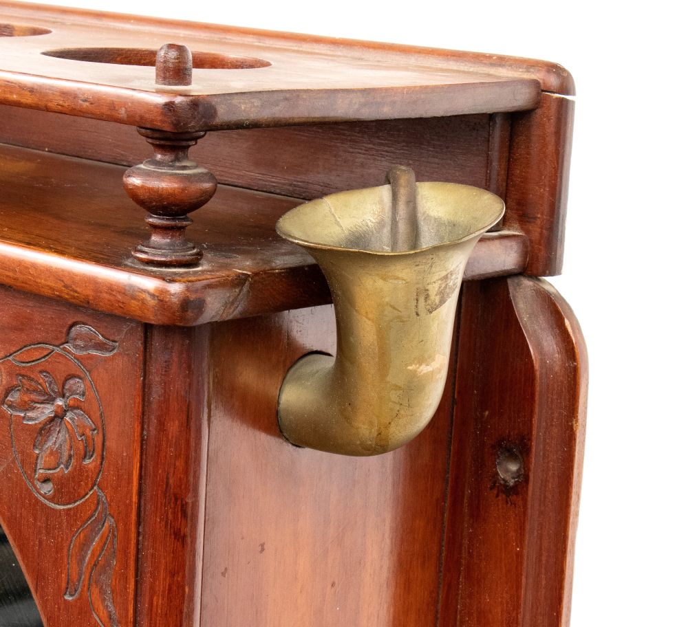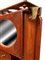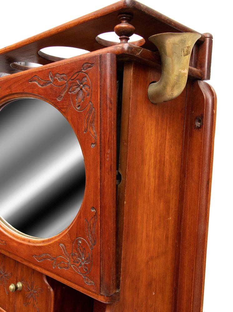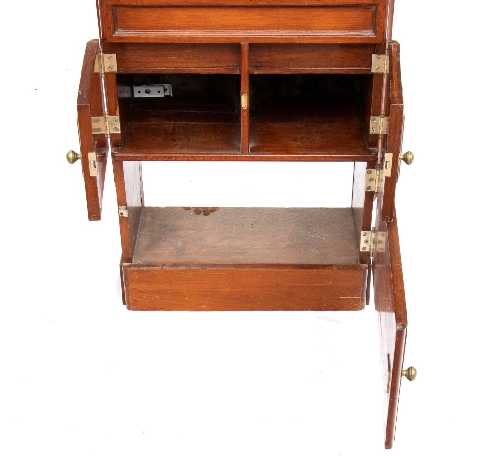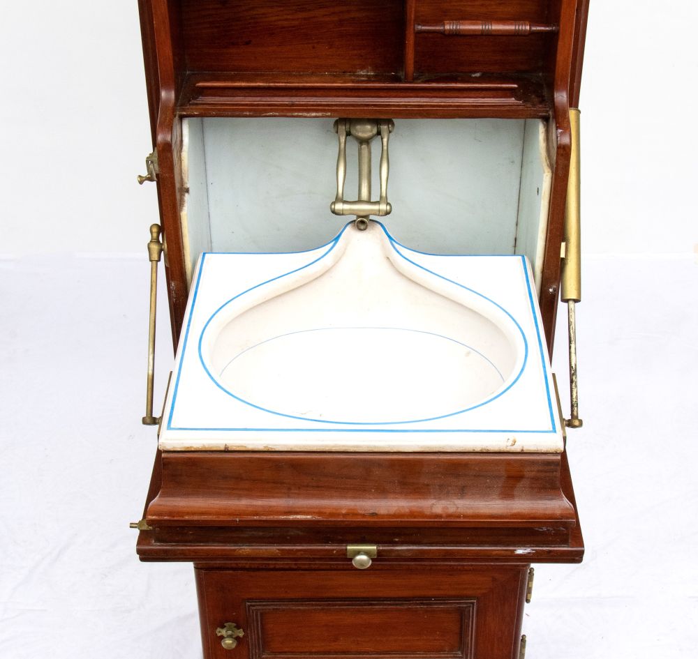 in mogano con finiture in ottone, caratterizzato da struttura modulare salva spazio a sviluppo verticale. Parte superiore con specchio ovale incassato estraibile e basculante con decoro floreale, tre fori circolari per contenitori. Vani a giorno, piccolo sportello ad doppia antae cassetto inferiore. Maniglie e cerniere in ottone, presenza di porta asciugamano laterale e porta boccale.