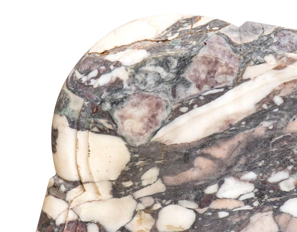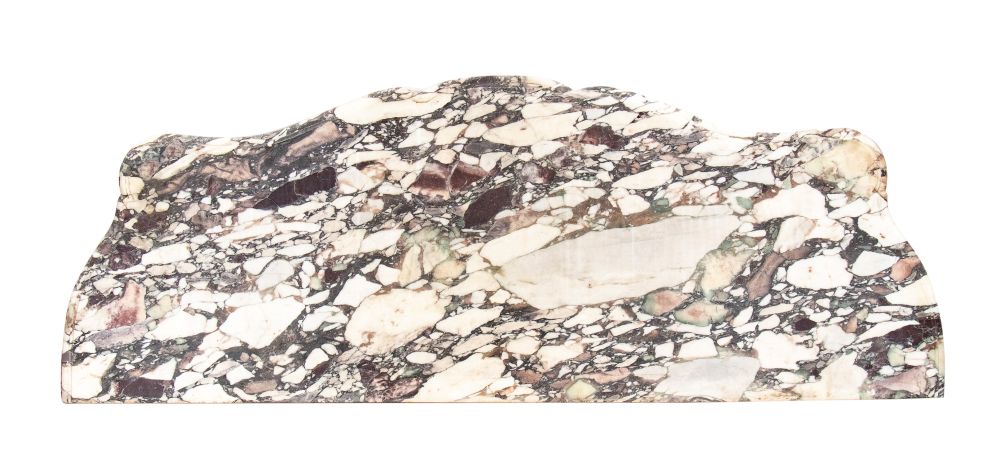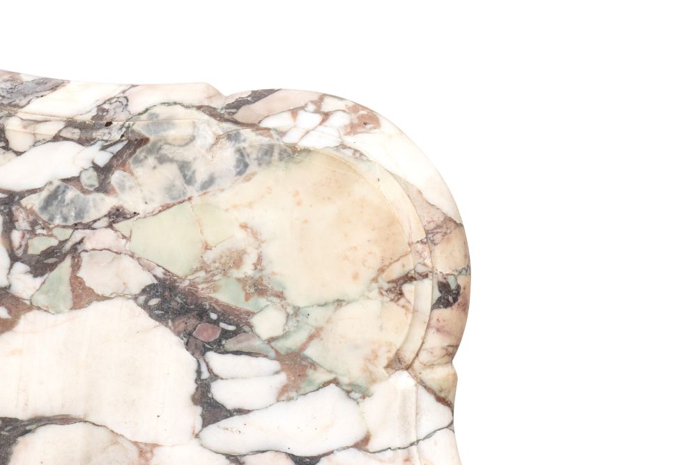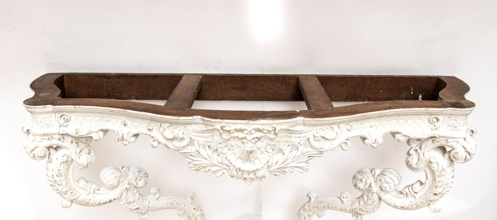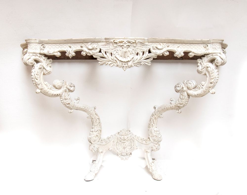 intagliata a motivi rocaille, volute fogliate, conchiglie e mascheroni. Gambe sagomate e unite da traversa scolpita. Piano in marmo breccia policromo.