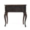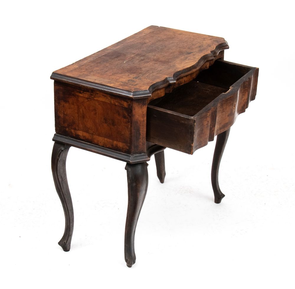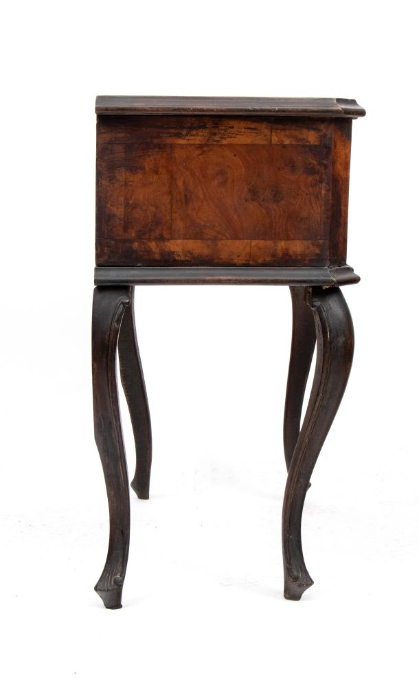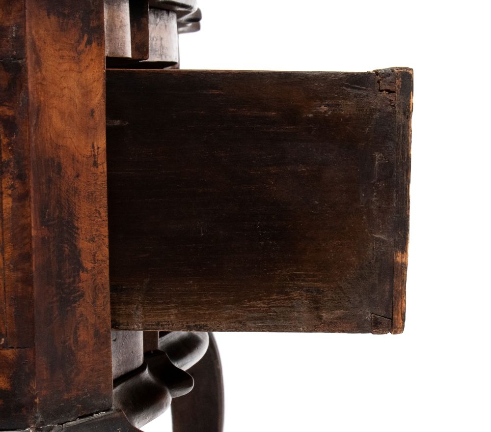 lastronato in legno di noce, piano sagomato e cassetto frontale, gambe mosse.