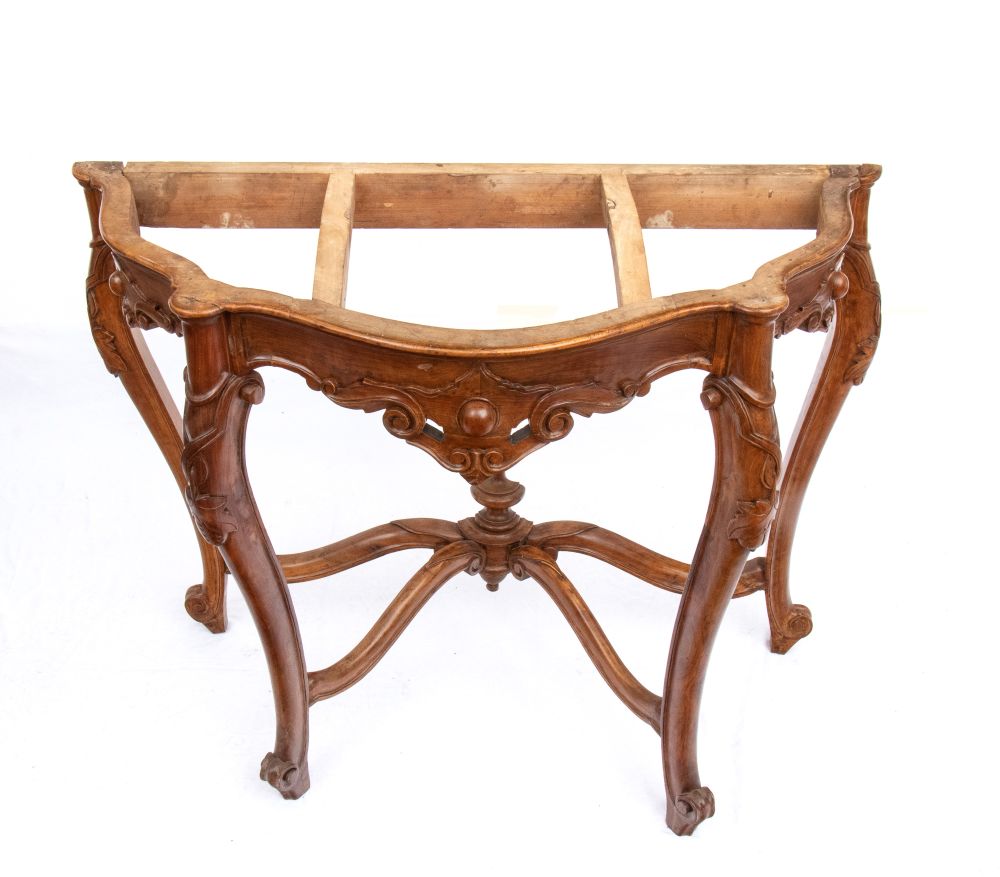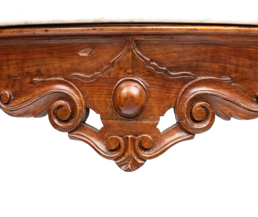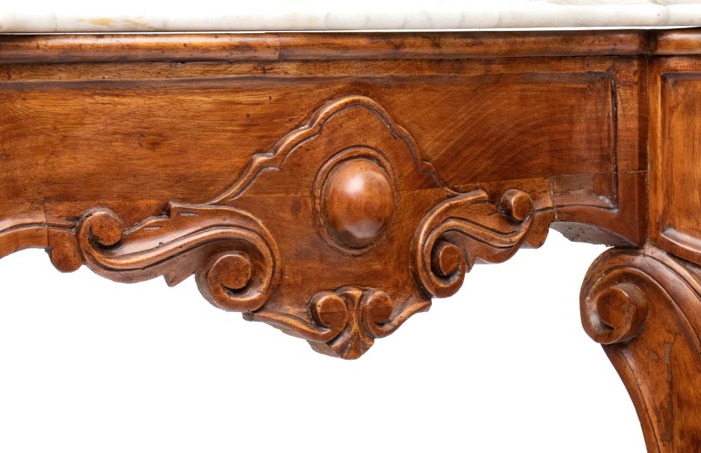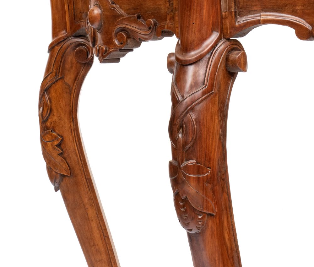 in legno di noce finemente intagliato, con decori vegetali e motivi rocaille. Piano sagomato intarmo bianco. Gambe arcuate e riunite da una crociera centrale tornita. La fascia sottopiatto è riccamente intagliata con volute motivo centrale a conchiglia.