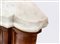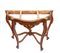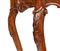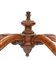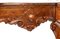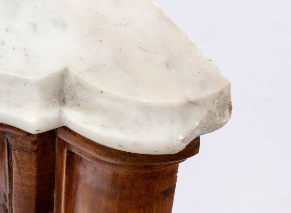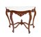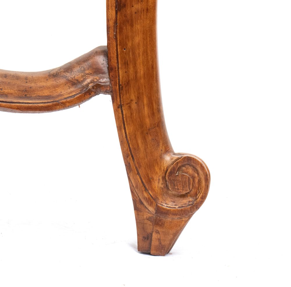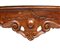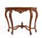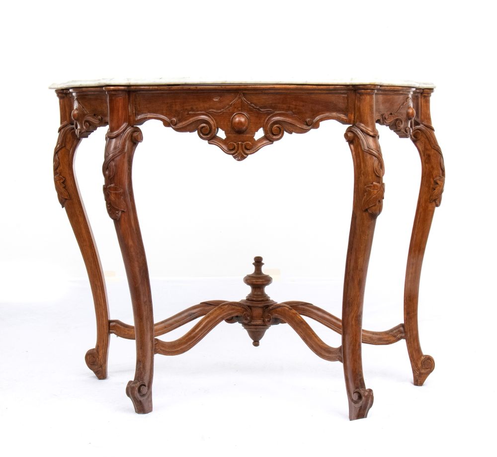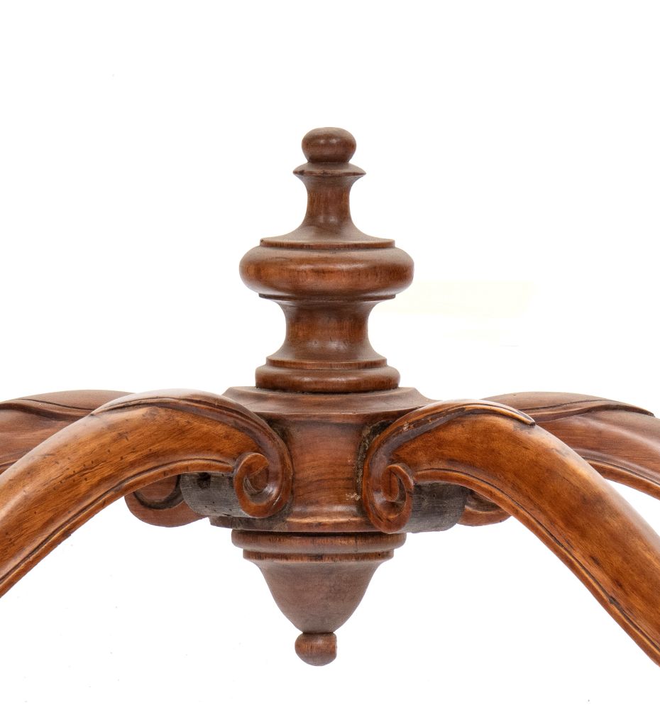 in legno di noce finemente intagliato, con decori vegetali e motivi rocaille. Piano sagomato intarmo bianco. Gambe arcuate e riunite da una crociera centrale tornita. La fascia sottopiatto è riccamente intagliata con volute motivo centrale a conchiglia.