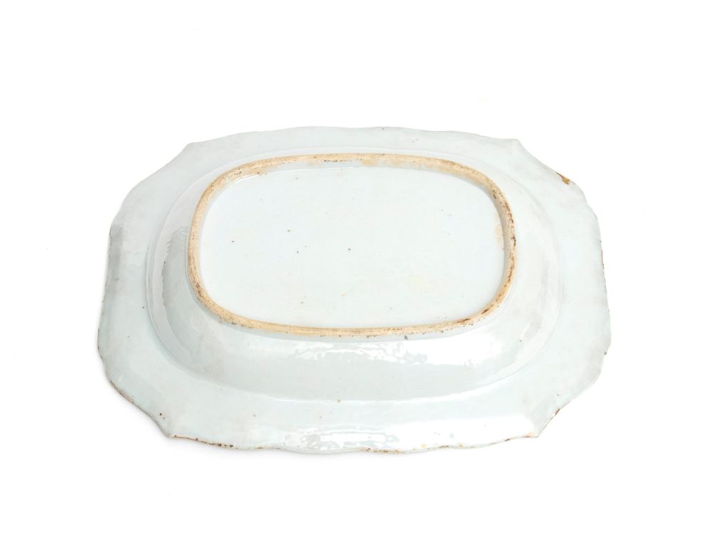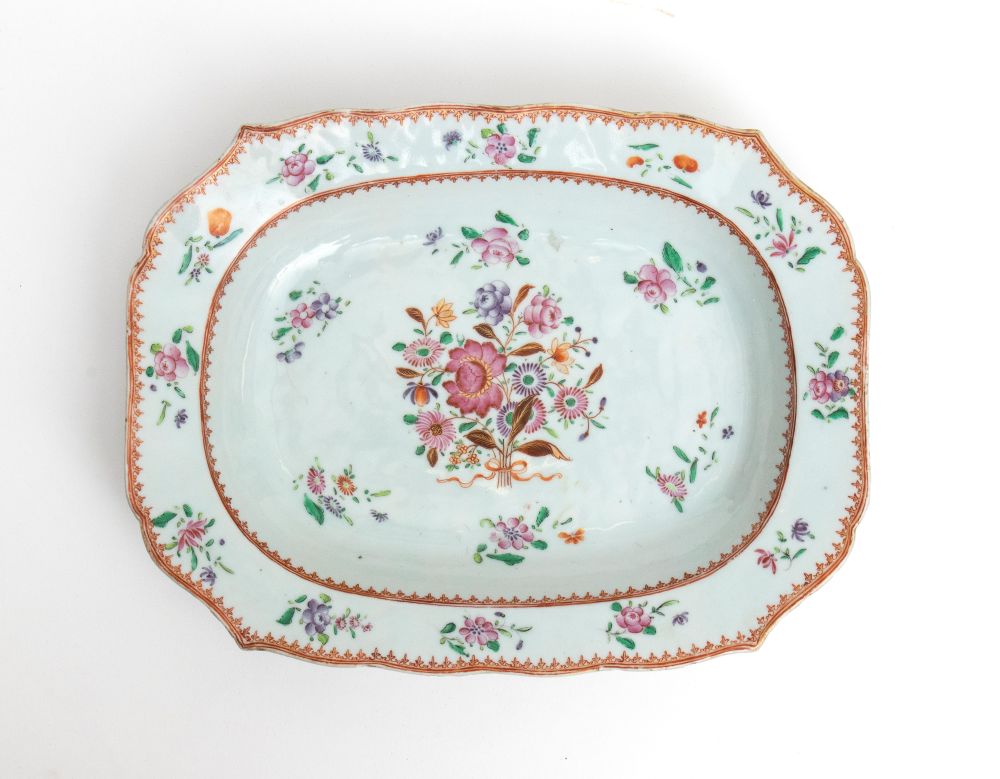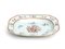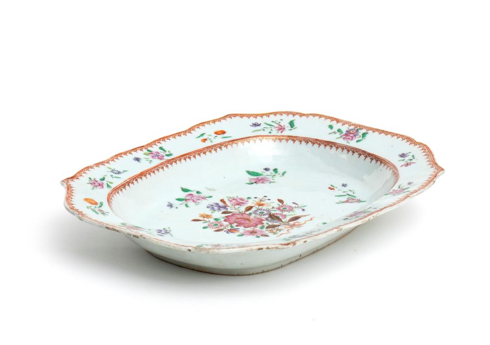 di forma ovale decorato a smalti policromi; al centro un bouquet di fiori, contornato da piccoli mazzetti floreali distribuiti lungo il bordo interno. Bordo sagomato presenta una raffinata cornice a motivi geometrici in rosso ferro e doratura. Esempio di porcellana cinese d'esportazione destinata al mercato europeo.