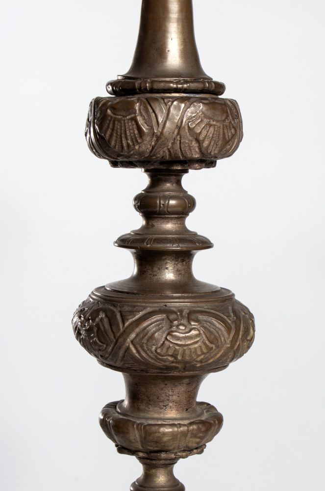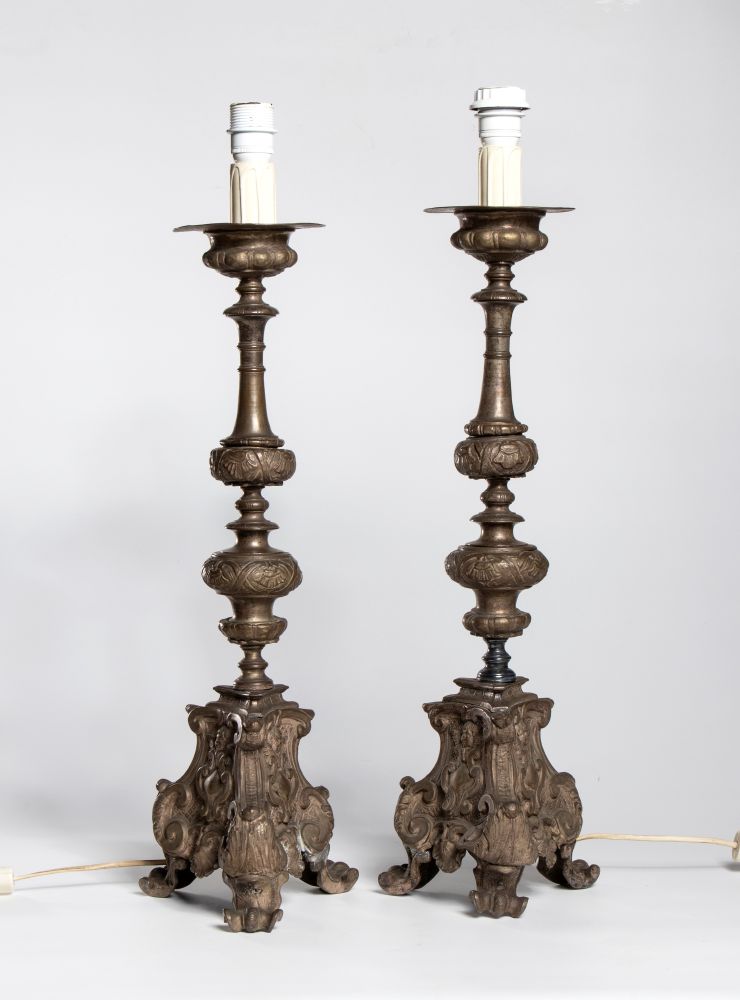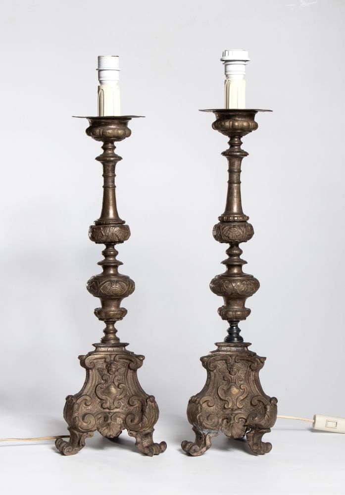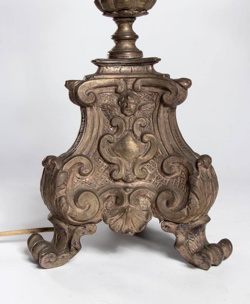 elettrificati e trasformati in lampade, finemente cesellati con base triangolare con viso di putti in rilievo sui tre lati.