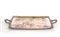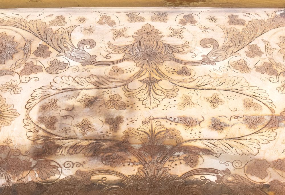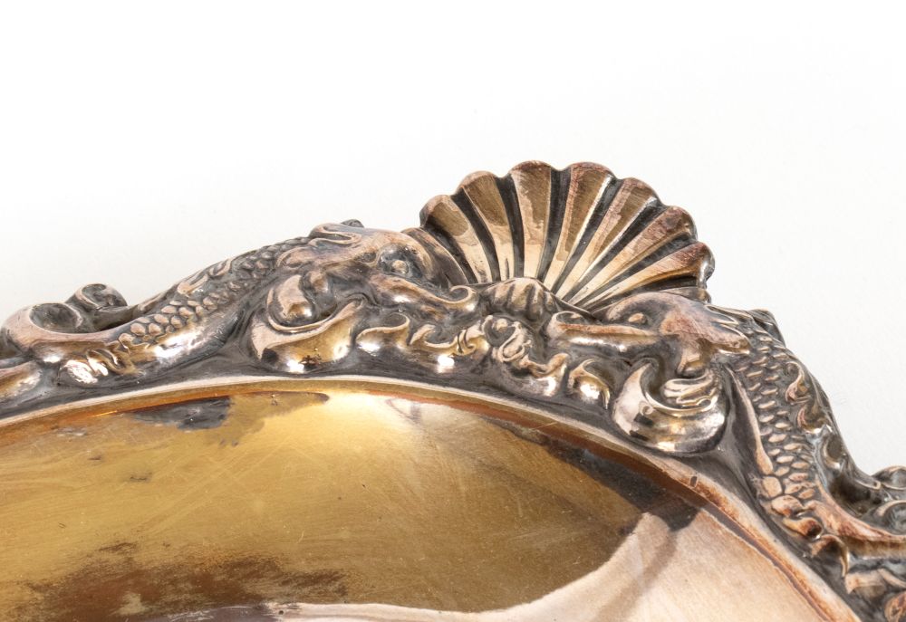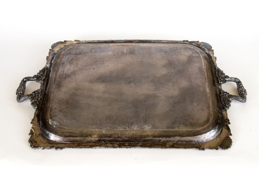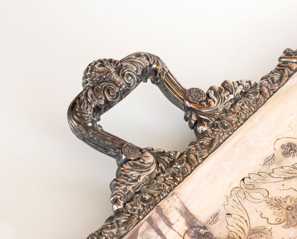 in Old Sheffield Plate, di forma è rettangolare con angoli arrotondati. E' caratterizzato da un ricco bordo a motivo Rococò revival di volute e conchiglie. Ai lati corti sono fissate due imponenti maniglie a ricciolo che riprendono la decorazione del bordo. Il campo centrale del vassoio è coperto da una fitta incisione floreale e vegetale, disposta in riserve simmetriche.