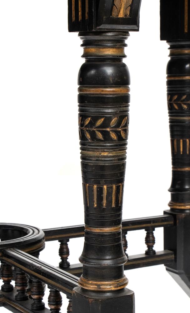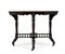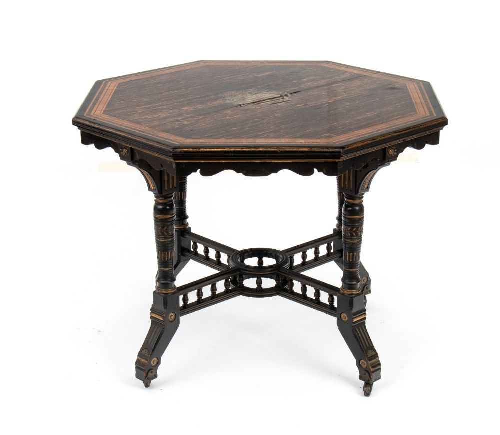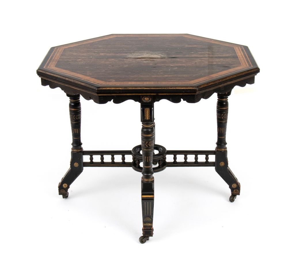 in legno di calamandra ed intarsi in satinwood, di forma ottagonale, dorato in alcune parti intagliate le gambe sono unite da una traversa a forma di ringhiera con la parte finale a forma di cilindro dove veniva inserito un vaso di fiori per abbellimento del tavolo.