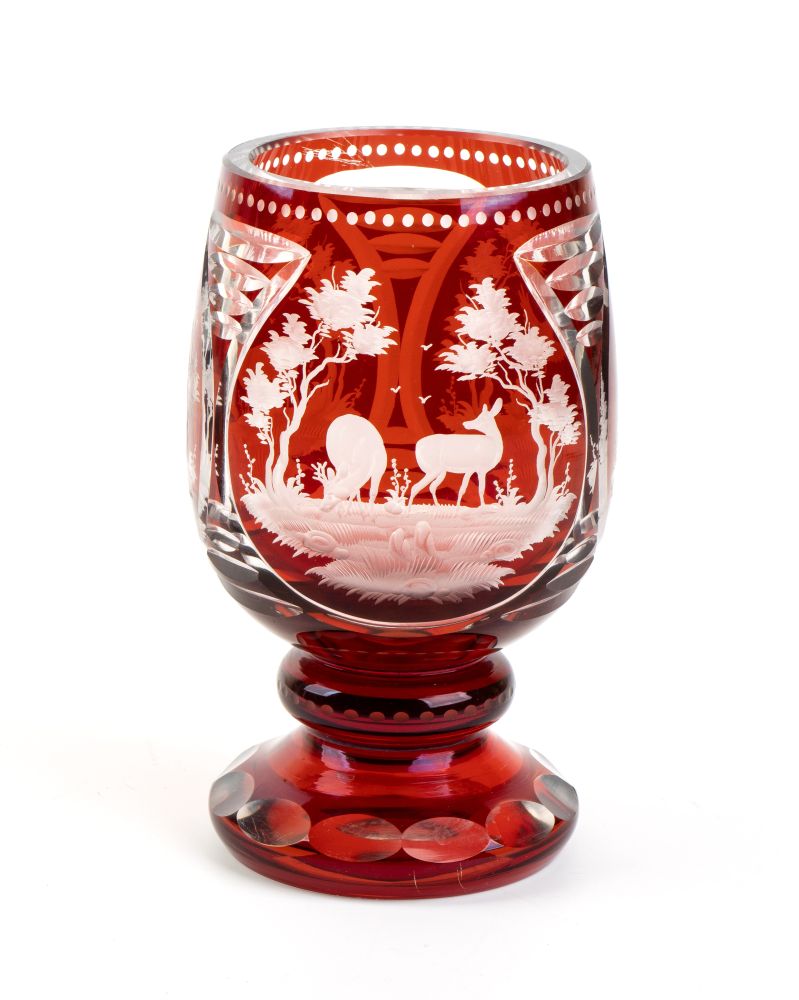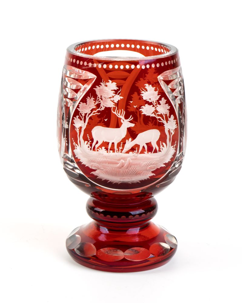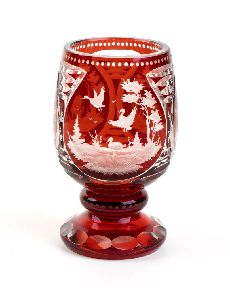di colore rubino, molato e inciso con paesaggi, uccelli e animali in stile Biedermeier.
