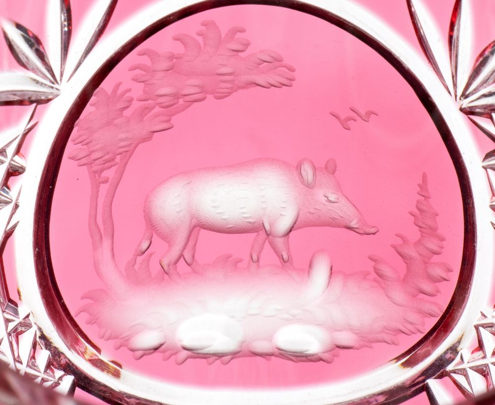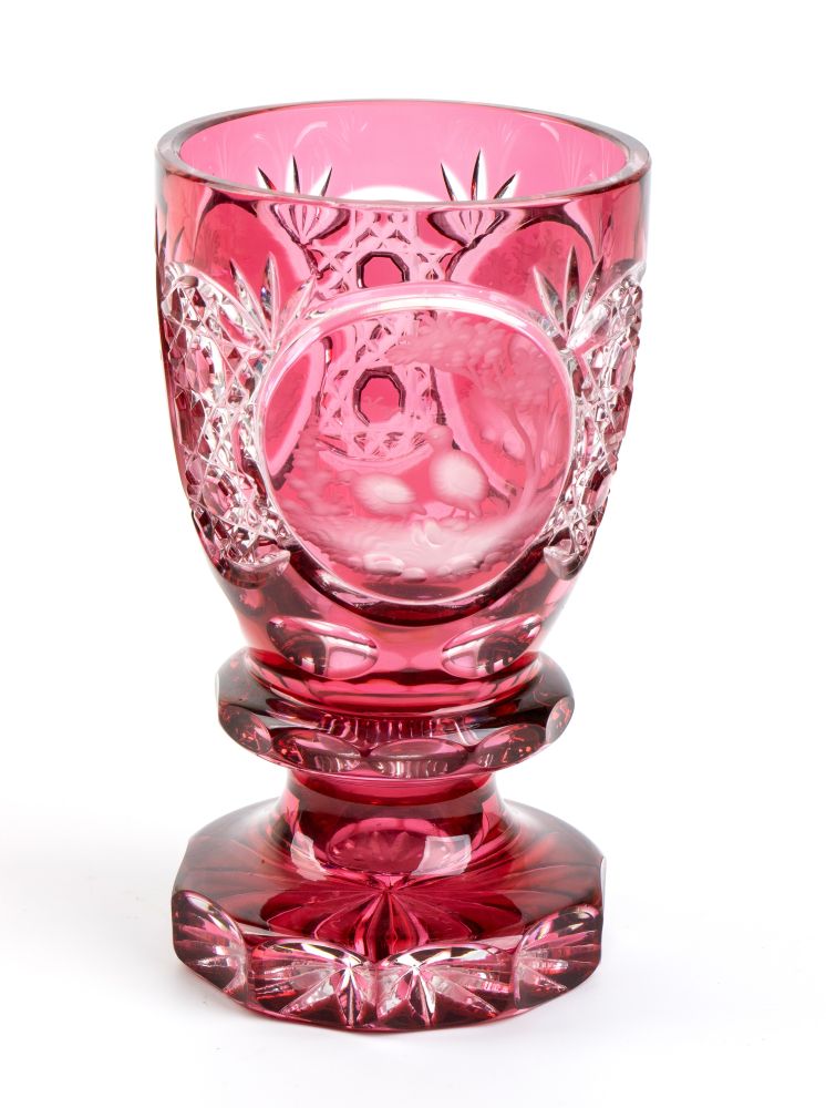 di colore rosa scuro, molato e inciso con paesaggi ed animali in stile Biedermeier.