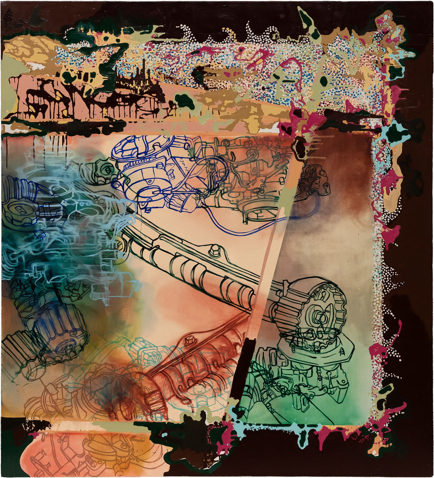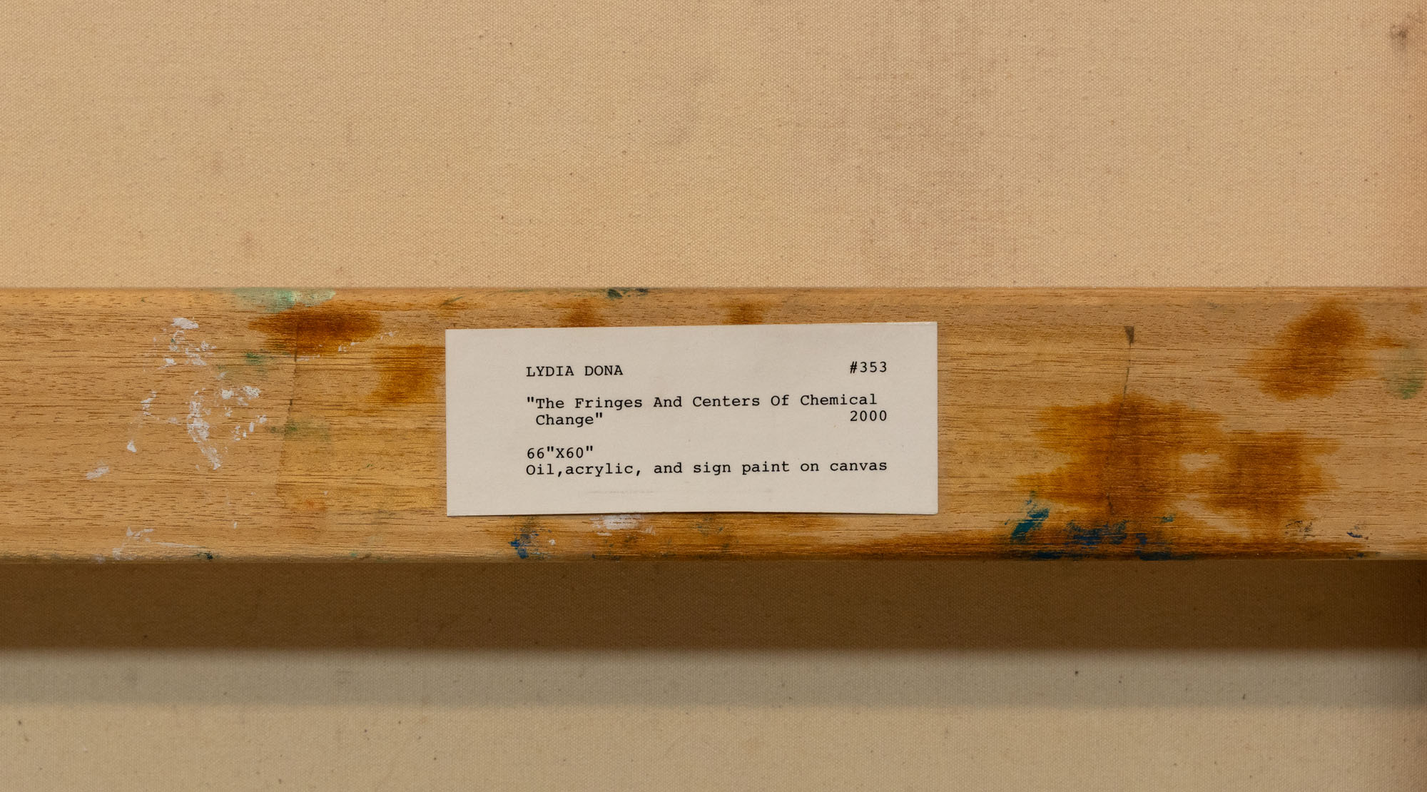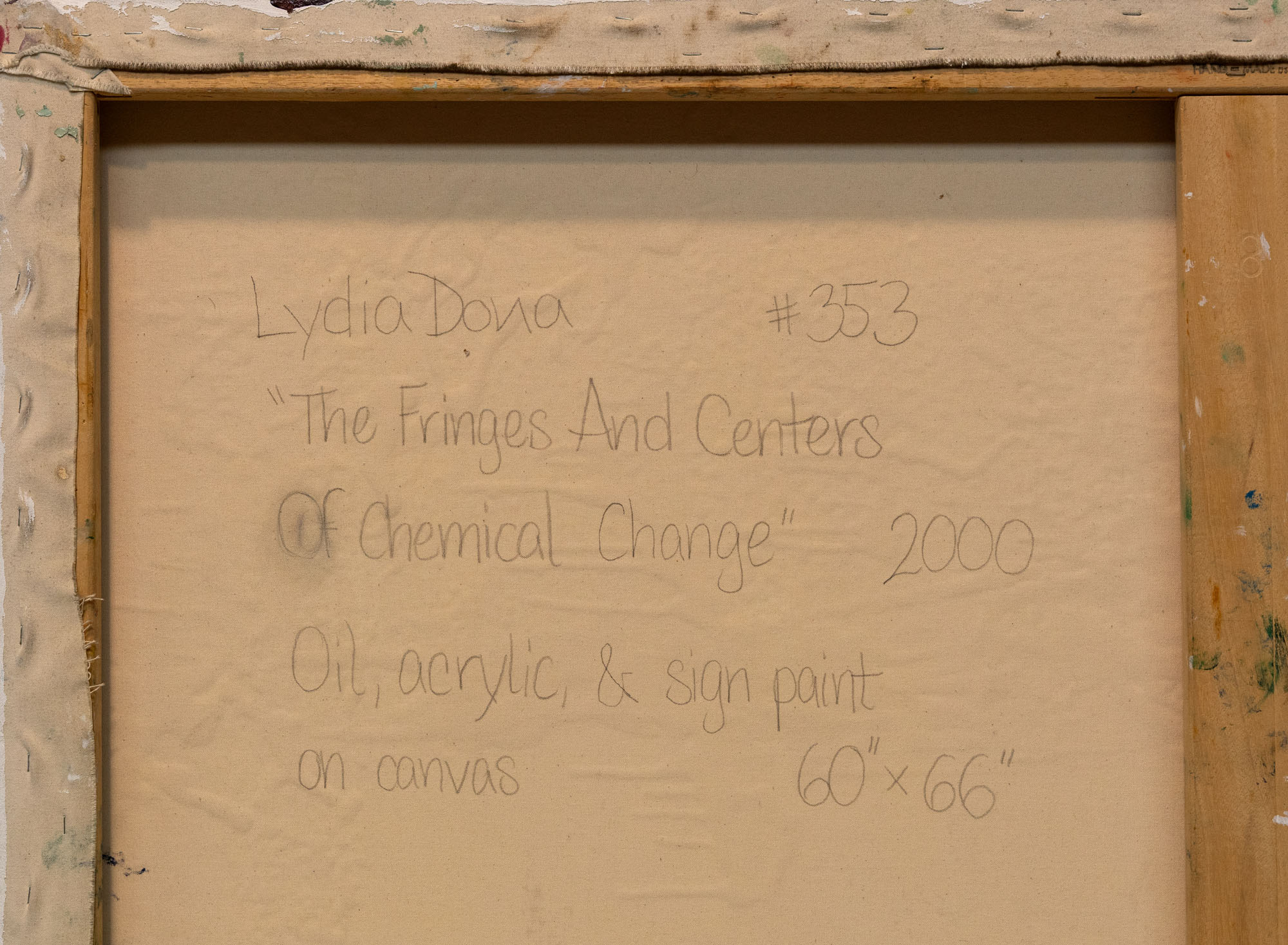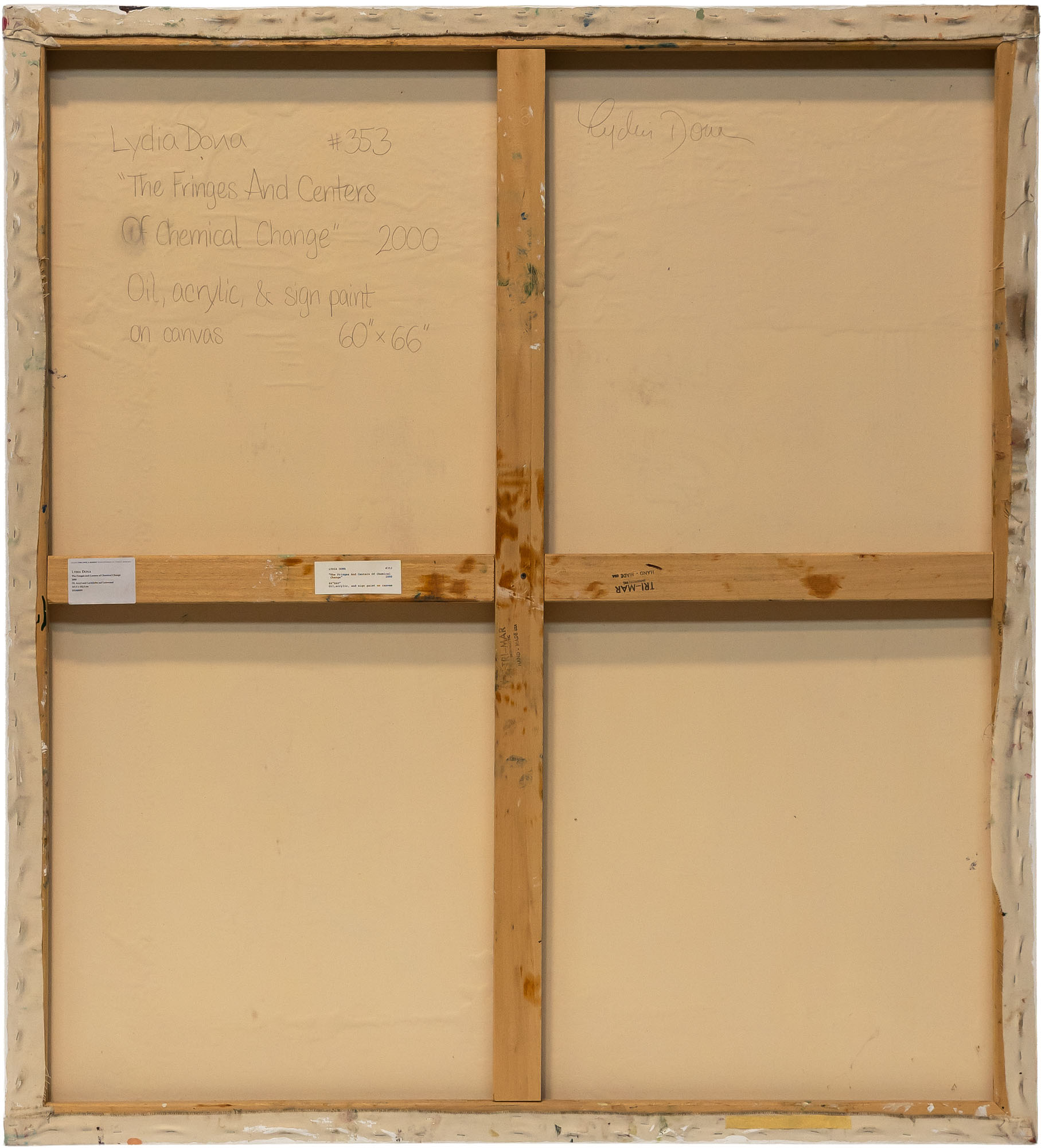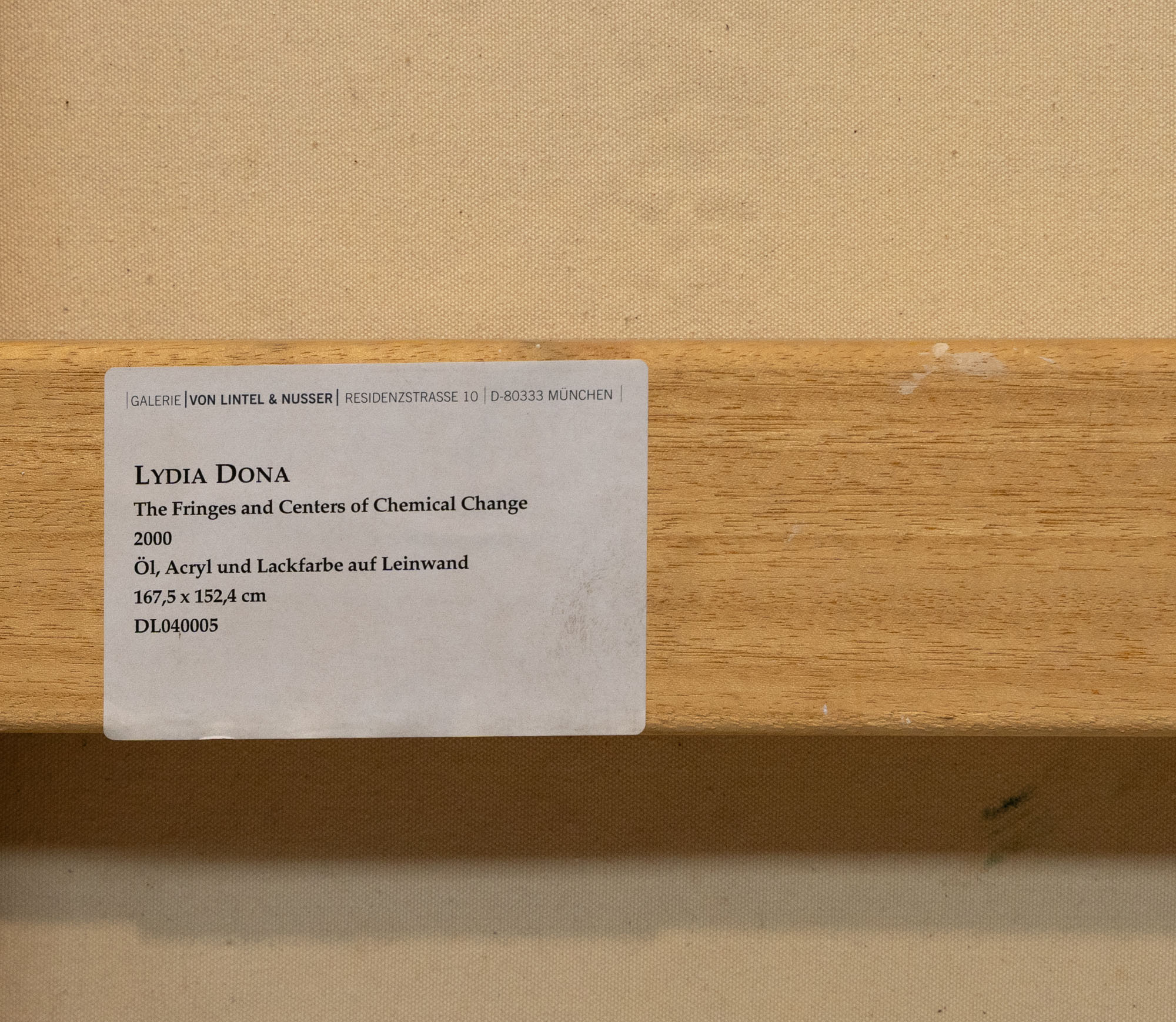 LYDIA DONA(1955)The Fringes And Centers of Chemical Change2000Acrilico, olio e vernice per insegne su tela168,5 x 152,5 cmFirma, data e titolo al retroOpera accompagnata da autentica su fotografia a cura della galleria MARELLA ARTE CONTEMPORANEA, Milano con dichiarazione di autenticità firmata dall'artistaPROVENIENZA:Galerie Von Lintel & Nusser, Monaco di Baviera (etichetta al retro)MARELLA ARTE CONTEMPORANEA, MilanoCollezione privata