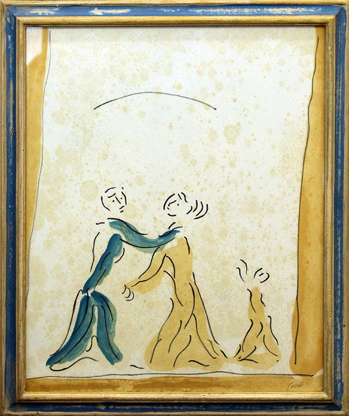VIRGILIO GUIDI,"Incontro" anni 70', litografia su cartoncino, cm 48x40 con cornice in omaggio 54x45x3 kg 2. Al fronte: firma in basso a destra e tiratura in basso a sinistra, esemplare 71\100. L'opera presenta fioritura. Certificato di provenienza della Daliano Ribani Arte. Opera con cornice in omaggio.