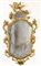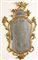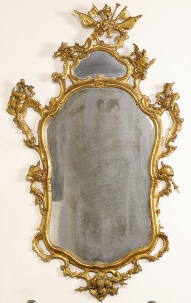 in legno intagliato e dorato sormontato da alta cimasa a volute centrata da specchio e da trofeo di armi, cornice sagomata con tralci rocaille ricadenti lungo i lati, cm 152x80 (2)