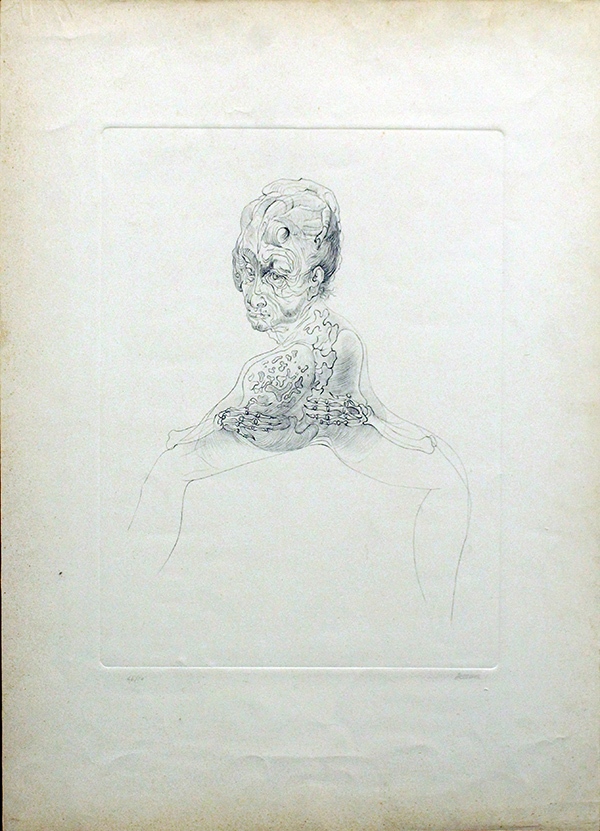 HANS BELLMAR, "Ritratto della madre di Alberto Giacometti", anni '60 circa, incisione all'acquaforte su cartoncino, cm 69,5x50. Al fronte: firma in basso a destra e tiratura in basso a sinistra, esemplare 46/50. Al verso: in alto a sinistra timbro della Galleria d'Arte il Mappamondo di Milano. L'opera presenta fioritura. Certificato della Daliano Ribani Arte. Opera senza cornice.