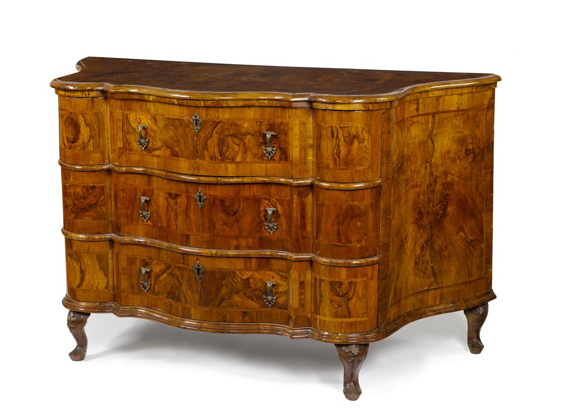 in noce e radica di noce, piano sagomato con becco di civetta, fronte e fianchi mossi, tre cassetti, piedi a voluta, cm 88x135x64