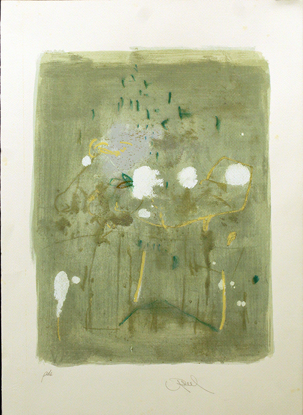 FIRMA ILLEGGIBILE, "Paesaggio astratto", anni 70, litografia su cartoncino, esemplare PDA, cm 70x50. Al fronte: firma in basso a destra e tiratura in basso a sinistra. Presenta piccoli segni del tempo. Senza cornice.