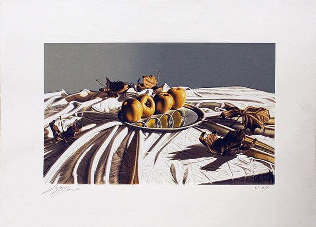 FIRMA ILLEGGIBILE, "Natura morta", anni '80, litografia su cartoncino, cm 50x70. Al fronte: esemplare 1/6 in basso destra e firma in basso a sinistra. Senza cornice. L'opera presenta leggera fioritura.