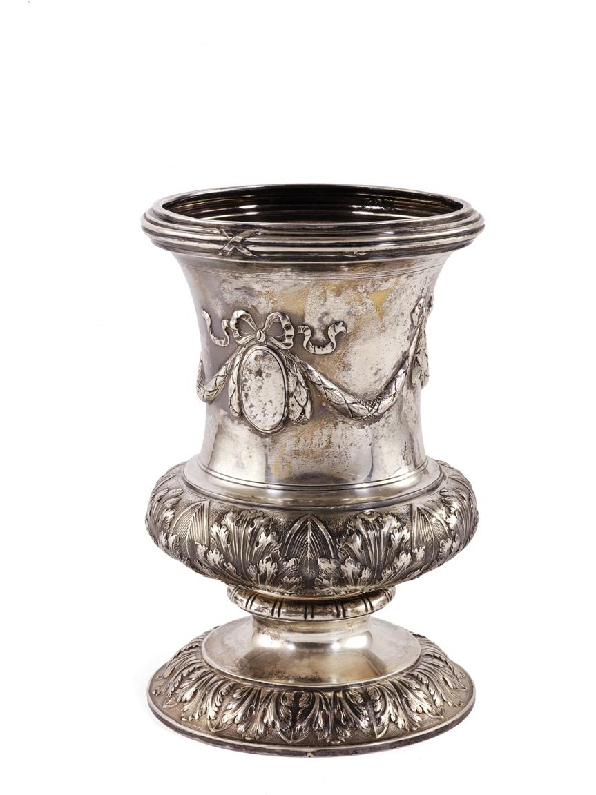 GRANDE VASOin argento sbalzato e decorato da festone trattenuto da fiocchi,...