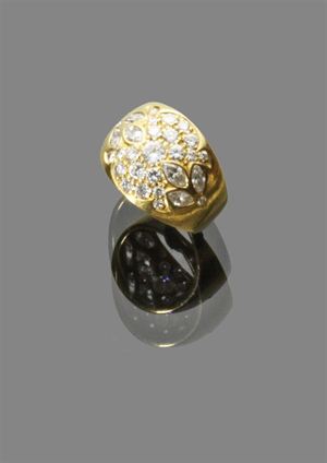 ANELLO Anello in oro giallo con pavè di diamanti taglio brillanti e navette per complessivi ct 1,10 Peso gr 9,90 yellow gold ring with diamond pavé and brillant cut diamonds apporx total 1.10 kt Weight 9.90 gr