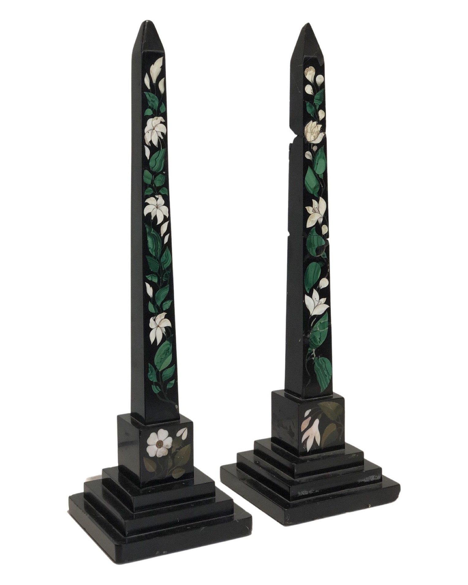 Coppia di obelischi in marmo nero intarsiato fine sec. XIX