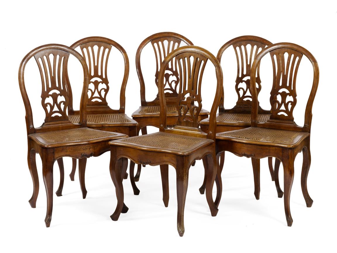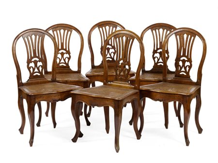SEI SEDIE, VENETOin noce, spalliera sagomata, seduta in canneté, gambe...