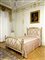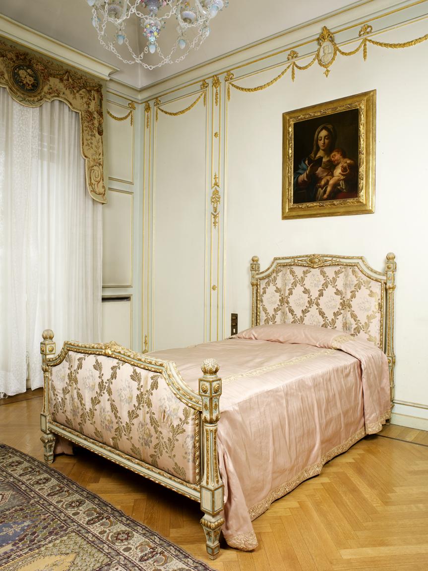 in stile Luigi XVI, in legno laccato, dipinto nei toni del celeste e dorato, ricoperto in seta rosa con decori fogliacei a losanga, gambe troncopiramidali con collarino, cm 196x157x214