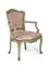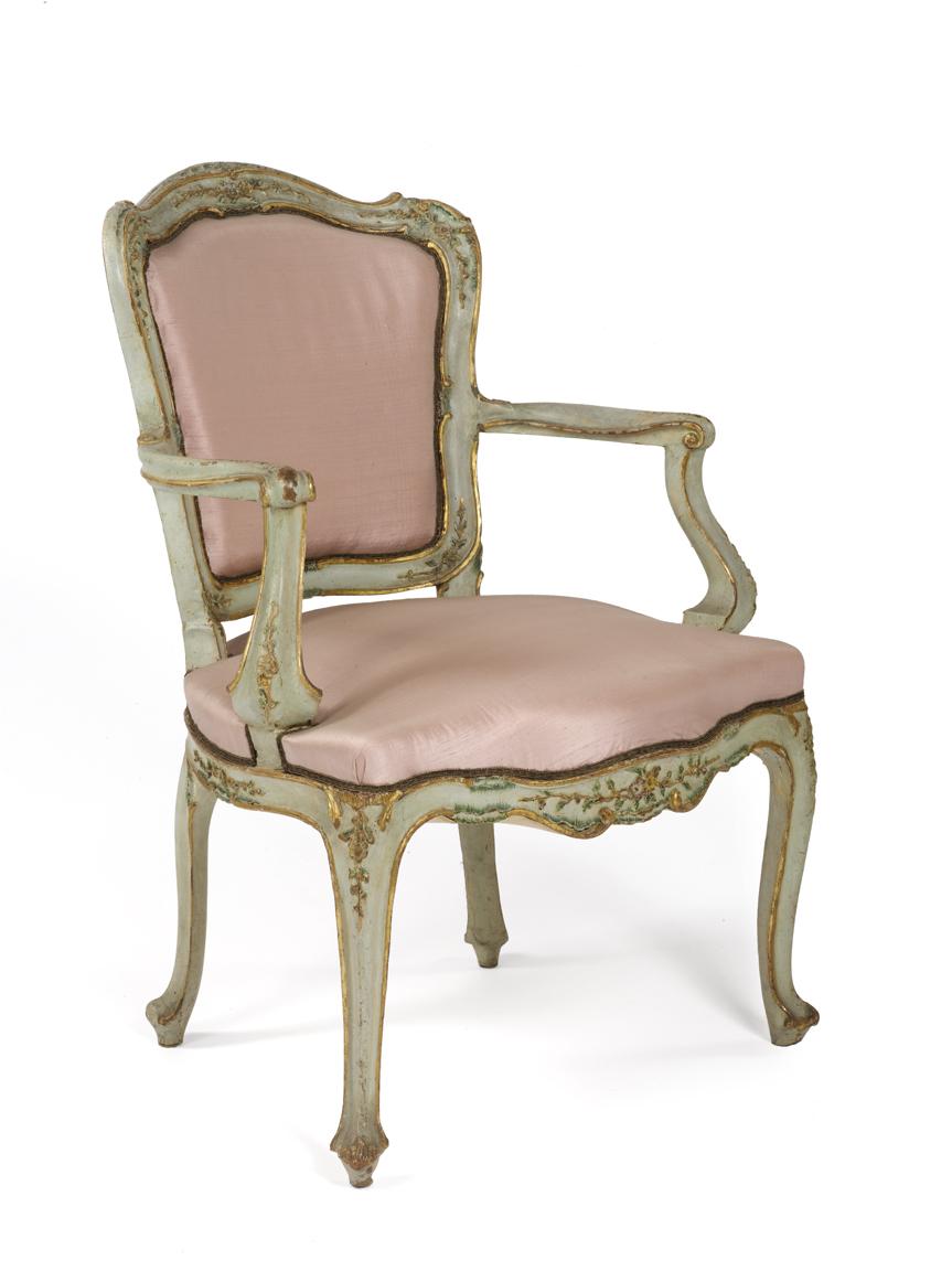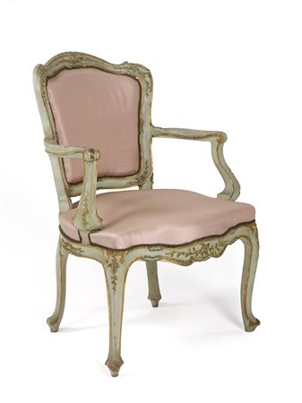 in legno laccato e dipinto, spalliera sagomata, braccioli a giorno su sostegni mossi, gambe mosse su piedi a ricciolo, ricoperta in seta rosa