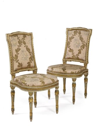 COPPIA DI SEDIE stile Luigi XVI, in legno laccato e dorato, spalliera...