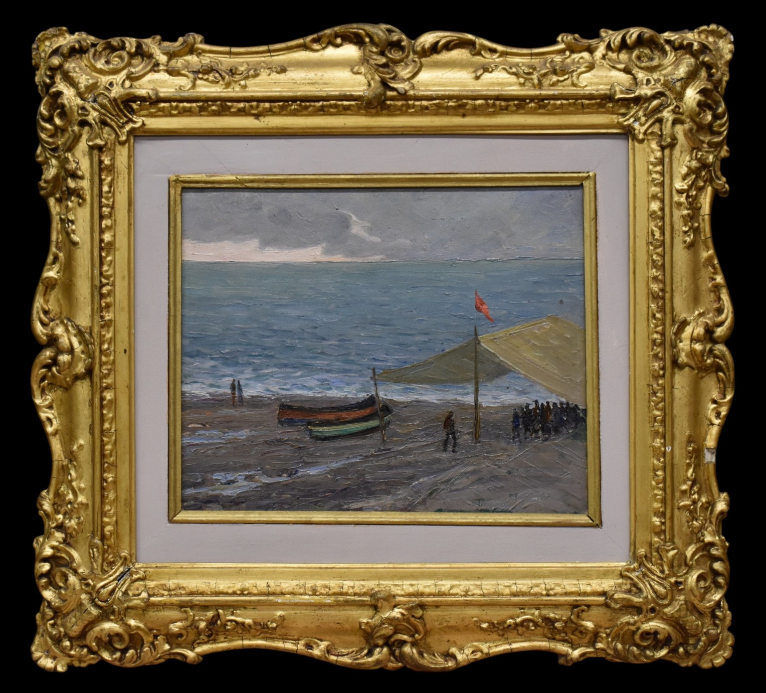 'Spiaggia con tendone e personaggi' olio su cartone