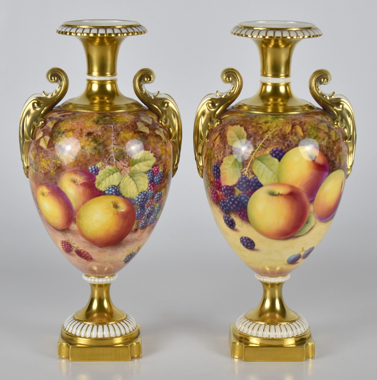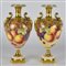 Coppia di vasi biansati in porcellana dorata e decorata in policromia con frutta
