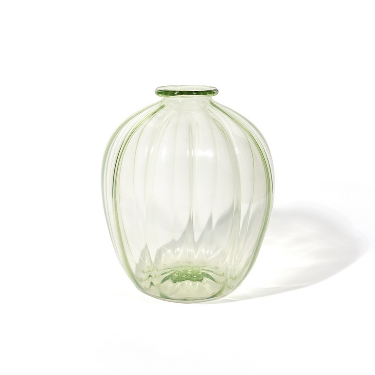 Un vaso in vetro costolato trasparente verdino.