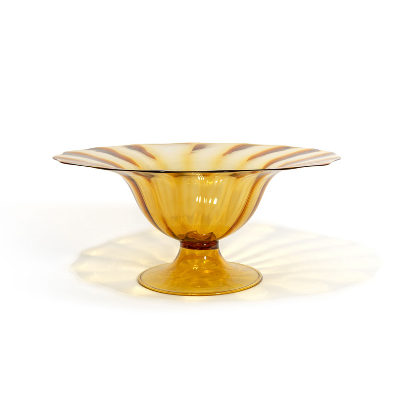 Una grande alzata costolata in vetro trasparente ambra.