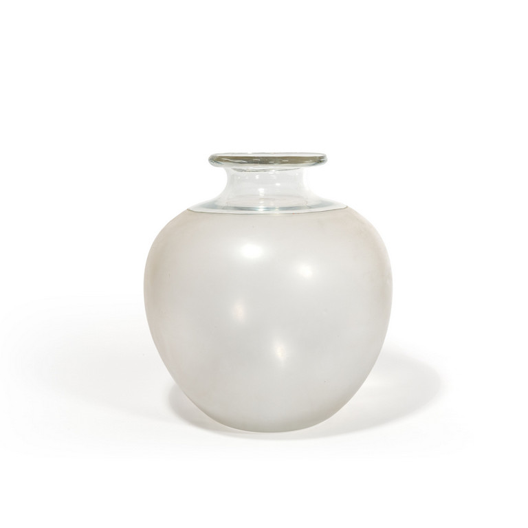 Un grande vaso in cristallo con corpo velato alla mola e collo trasparente.